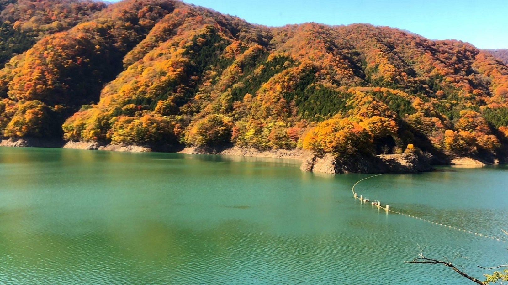 鬼怒川の上流に位置する五十里ダムと川治ダムは、赤色や黄色に色づく自然の木々と、橋やダムの堤体などの建造物が織りなす景色に定評がある紅葉スポットです。五十里ダムは山肌一面が錦のように紅葉し、川治ダムは国内屈指の堤高を誇るアーチ式のダムで、国内でもトップレベルの高さのあるアーチの曲線美を感じることができます。また、水面は川治ブルーと称されるエメラルドグリーンで、紅葉とのコントラストが楽しめます。