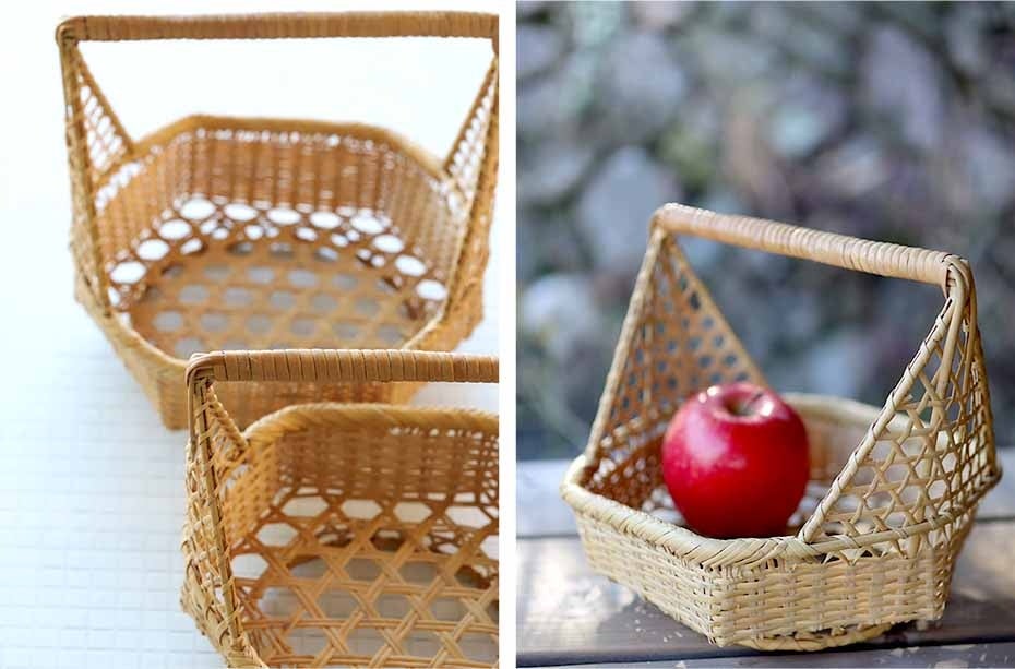 スズ竹六角豆腐籠は、持ち手付きの素朴な竹籠で、もともとは豆腐の水切り用に使われていたものです。底に付いた足が高台として機能し、通気性に優れているため、果物籠やパン籠としても最適です。六角形のデザインに、しっかりとした持ち手部分を籐で巻くことで耐久性を向上させました。側面に施されたユニークなあしらいがスズ竹六角豆腐籠の魅力を引き立て、見た目にも楽しめる籠となっています。