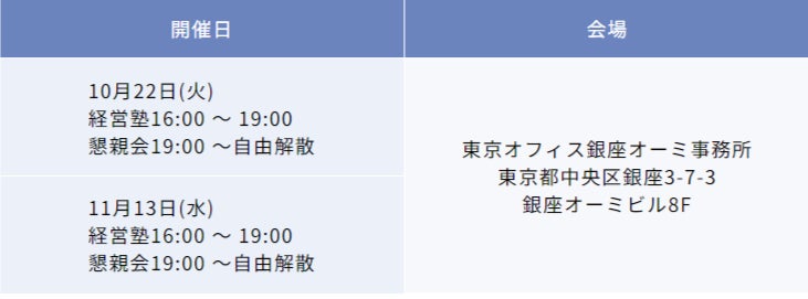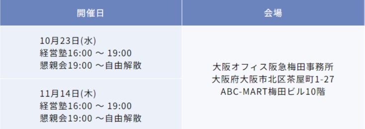 株式会社ストライク(東京都千代田区、代表取締役社長:荒井邦彦)は10月22日(火)・23日(水)、11月13日(水)・14日(木)にベンチャーサポート相続税理士法人による事務所見学会・経営塾を開催します。