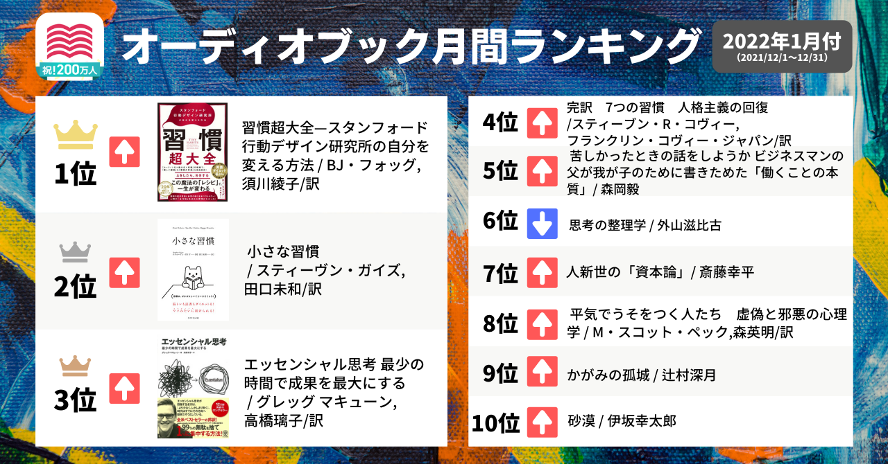 【「audiobook.jp」1月人気ランキング】「習慣」をテーマにした オーディオブックが人気傾向に。『習慣超大全』が1位、『小さな習慣』が2位にランクイン