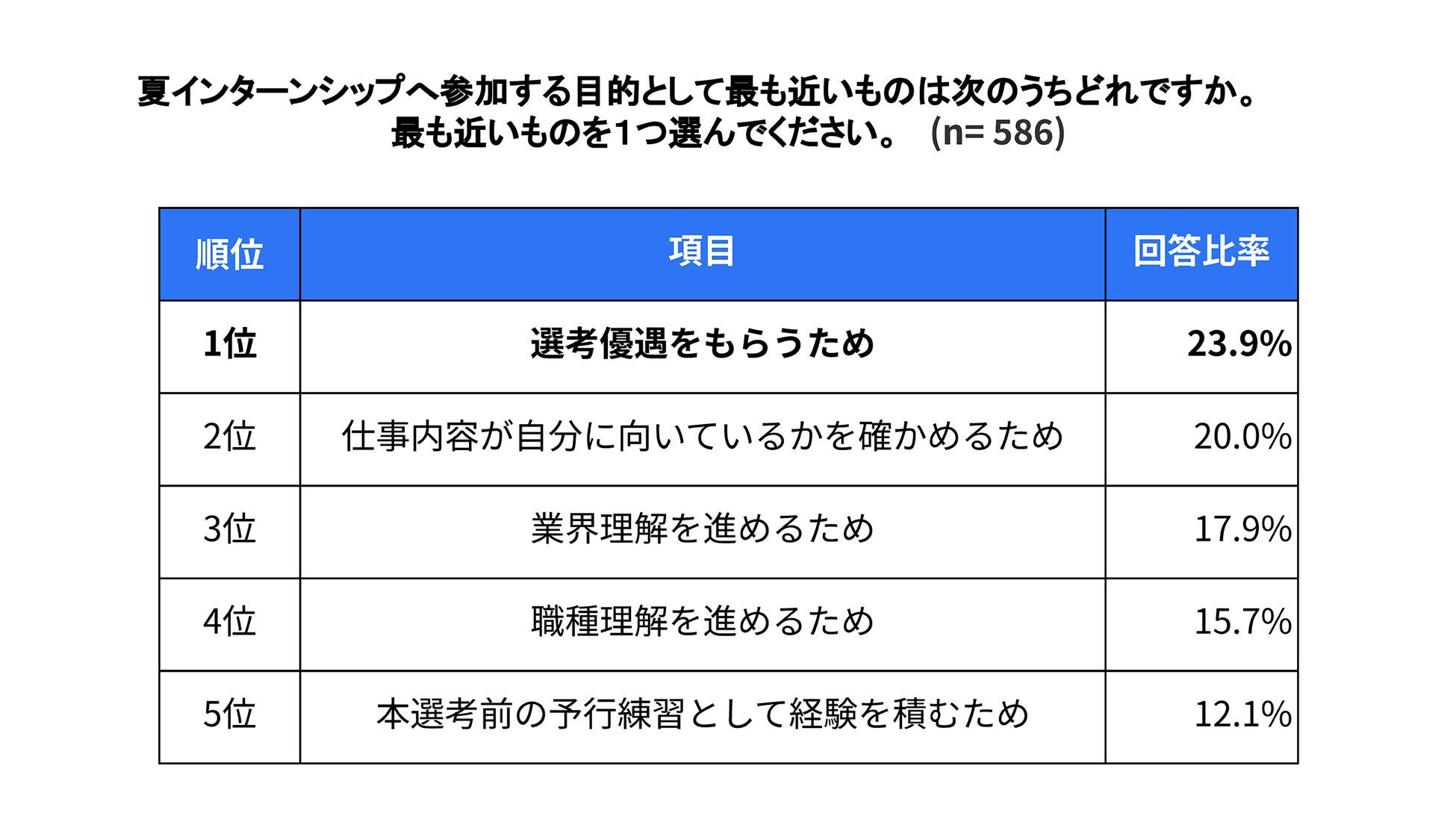 昨年の調査と比較すると、「選考優遇」は約5ポイント減少(昨年28.6%)しました。その一方で、「仕事内容が自分に向いているかを確かめるため(知るため)」は約5ポイント上昇(昨年15.1%)しており、夏インターンシップの段階で自分に向いている仕事を見極めたい学生が増加しているようです。