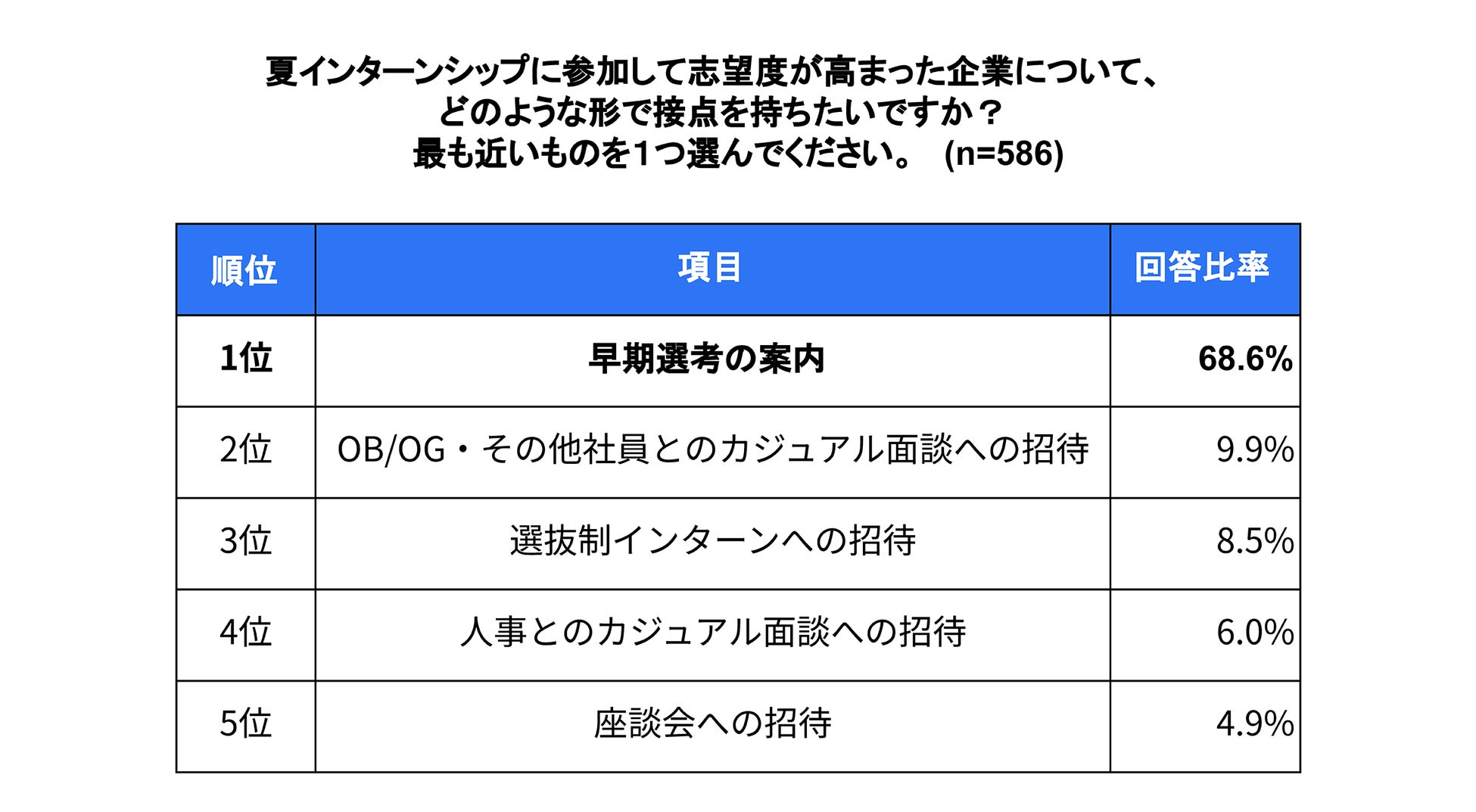夏インターンシップへ参加し志望度が高まった企業についてどのような形で接点を持ちたいかを尋ねたところ、「早期選考の案内」(68.6%)が「OB/OG・その他社員とのカジュアル面談への招待」(9.9%)や「選抜制インターンへの招待」(8.5%)を大きく引き離しました。
