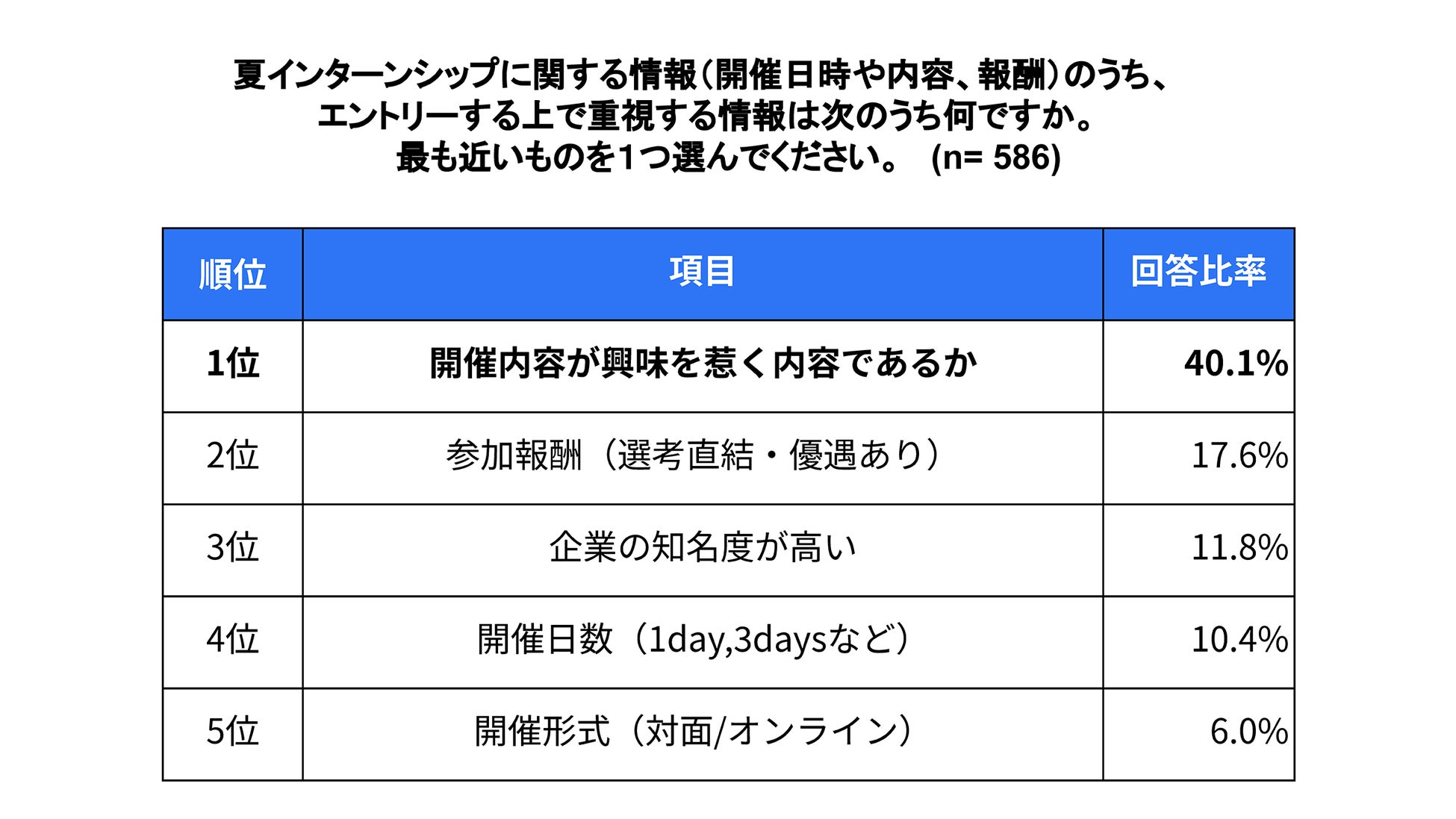 夏インターンシップにエントリーする上で重視する情報は、「開催内容が興味を惹く内容であるか」が40.1%で最も高く、次いで「参加報酬(選考直結・選考優遇あり)」が17.6%となりました。2で示した通り、学生は参加目的として「選考優遇」を狙う意識が高いですが、それ以前にインターンシップの内容が充実していなければエントリー先として興味を持ちづらいようです。
