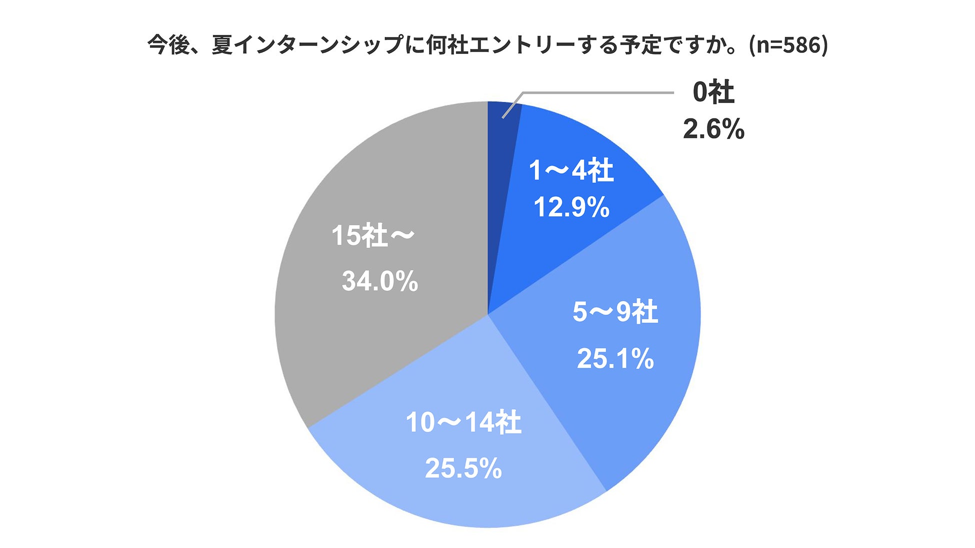 今後のエントリー予定については、15社以上が34.0%、次いで10〜14社(25.5%)、5〜9社(25.1%)、1〜4社(12.9%)、0社(2.6%)で、中央値は「10社」でした。学生の夏インターンシップへの参加意欲は高いことから、調査後の6月中旬以降からエントリーは本格化し始めていると推測されます。