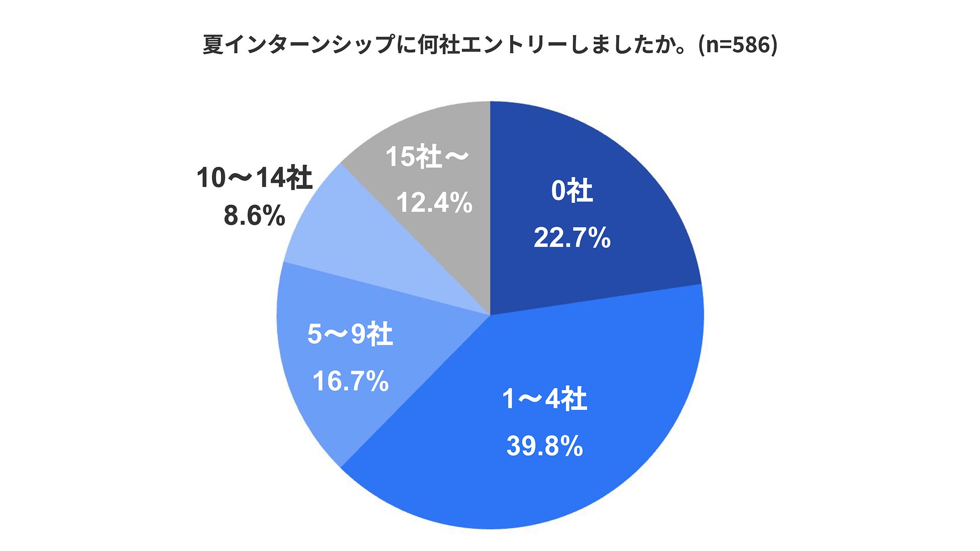 6月初旬時点での「夏インターンシップのエントリー状況」について尋ねたところ、全体のおよそ8割が少なくとも1社にはエントリーしていることがわかりました。1〜4社と回答した学生は39.8%、次いで5〜9社(16.7%)、15社以上(12.4%)、10〜14社(8.6%)の順となり、中央値は「3社」となりました。まだエントリーをしていない学生は22.7%でした。