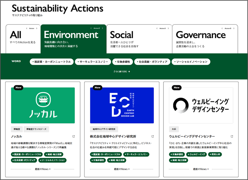 今回開設した「Sustainable Future with Creativity」では、グループ各社のサステナビリティに関する取り組みや最新ニュースを、Environment(環境)、Social(社会)、Governance(ガバナンス)領域ごとに一覧で紹介。社会課題に対応する生活者の行動変容を促す取り組み、グループ内外での共創により生まれた取り組み、自社の社員の意識改革のための取り組みなど、幅広くご紹介しています。