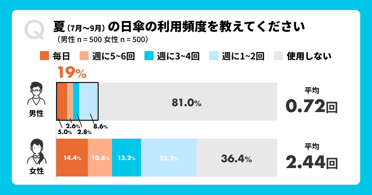 男女の夏(7月〜9月)の日傘の使用頻度を調査した結果、「週に一回以上」日傘を使用する方は、女性が63.6%、男性が19%となりました。また、「平均使用回数/週」は、女性が2.44回、男性が0.72回となり、使用頻度に3.38倍の差があることがわかりました。
