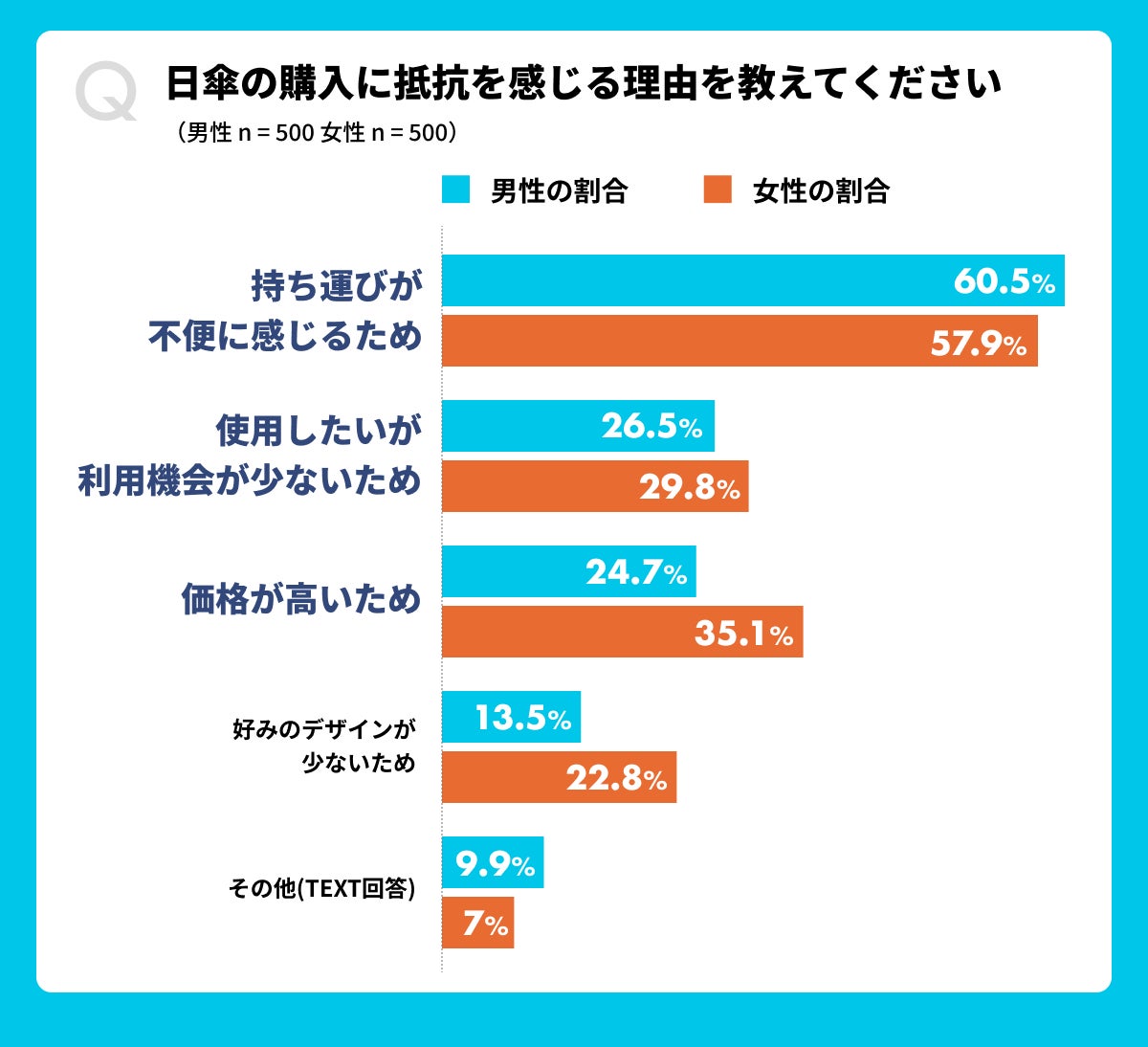 日傘の購入に抵抗を感じる理由としては、男女ともに、「持ち運びが不便に感じるため(女性57.9%・男性60.5%)」が最も多い結果となりました。