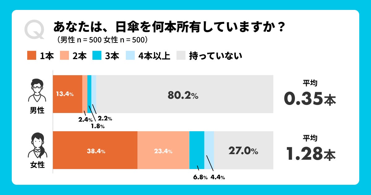 日傘の所持数について調査したところ、日傘を「持っていない」女性が27.0%、男性が80.2%となり、日傘の「平均所有数」は、約1.28本(女性)に対して、約0.35本(男性)と3.65倍の差があることがわかりました。
