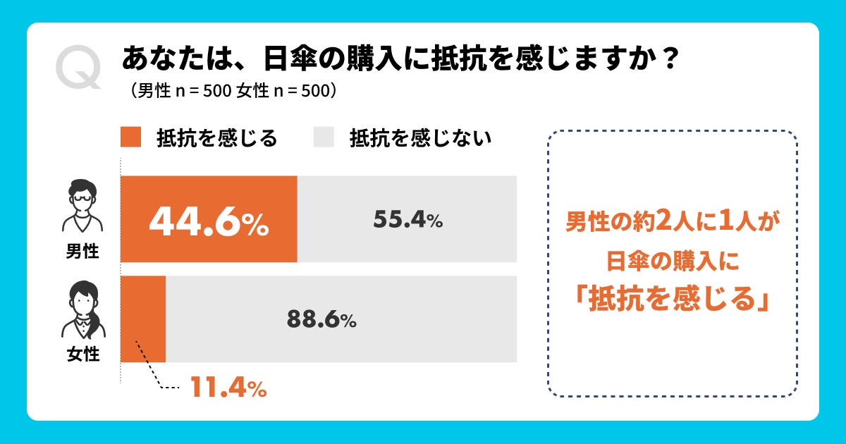 また、「日傘の購入に抵抗を感じますか」という質問に対して、女性(11.4%)の3.91倍となる、約2人に1人(44.6%)の男性が「抵抗を感じる」と回答しました。女性に比べて、男性が日傘の購入に対して高い心理的障壁を持っている様子がうかがえます。