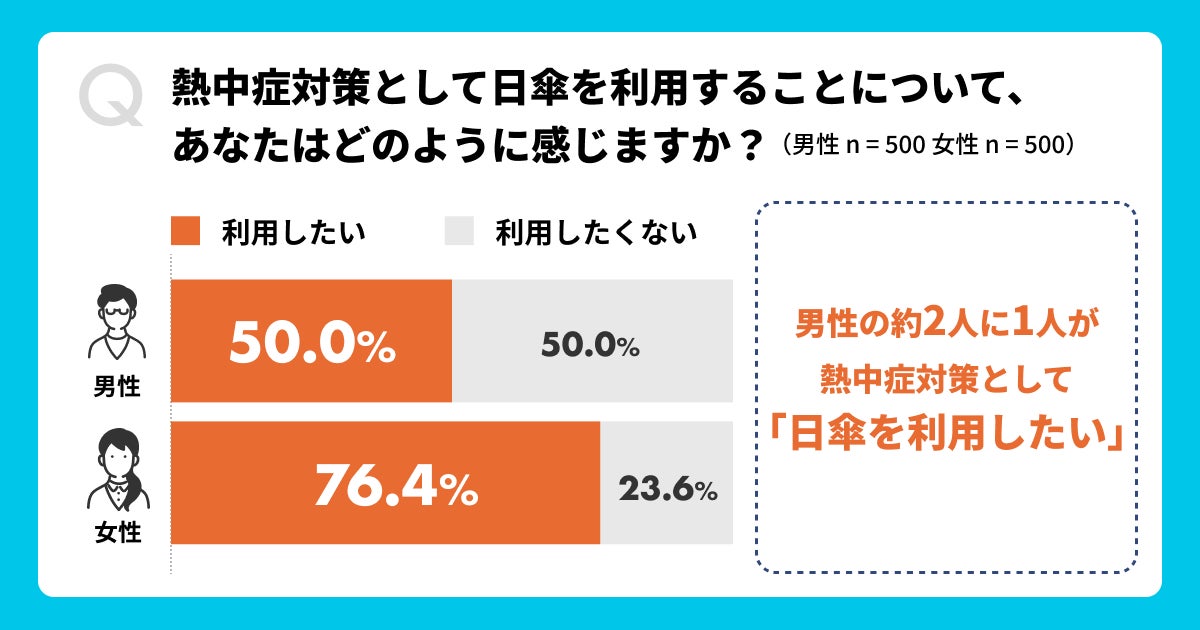 熱中症対策として日傘を利用することについて、男性の5割が「利用したい」と考えていることがわかりました。女性(76.4%)と比較すると、26.4%を下回りますが、男性の日傘需要が一定数ある様子がうかがえる結果となりました。