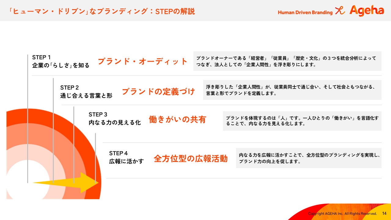 弊社ではこの新しいブランディングの捉え方を「Human Driven Branding」と呼び、各社のコーポレートブランディングにワンストップで伴走しています。その導入ステップは、「1. 企業の“らしさ”を知る:ブランドオーディット」「2. 通じ合える言葉と形:ブランド定義」「3. 内なる力の見える化:働きがいの共有」「4. 広報に活かす:全方位型の広報活動」です。