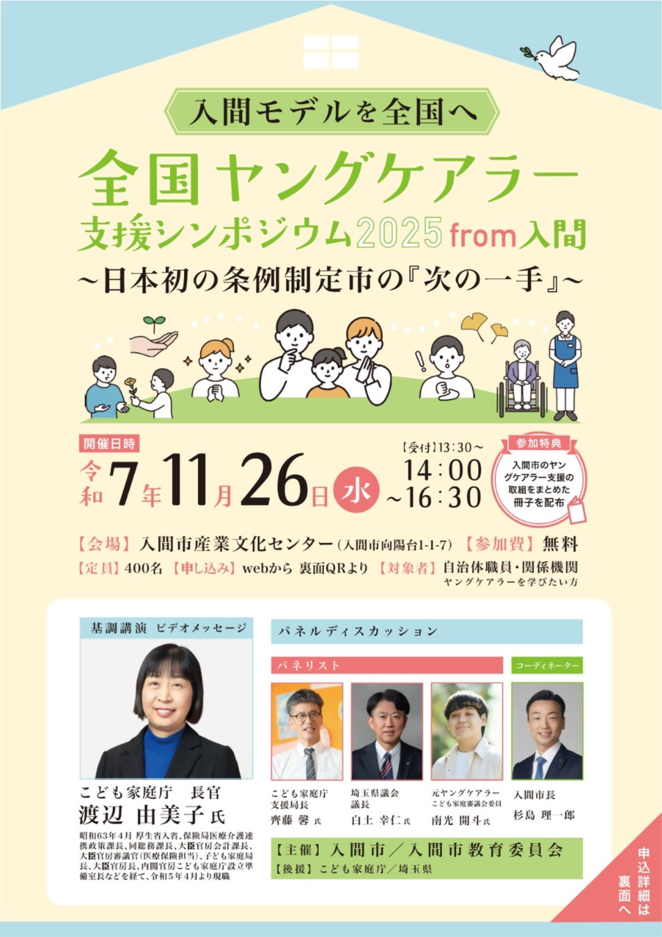 日本初のヤングケアラー支援条例を制定した埼玉県入間市が、11月26日、全国の自治体関係者・支援者などに向けてシンポジウムを開催。こども家庭庁支援局長、埼玉県議会議長、国こども家庭審議会委員(元ヤングケアラー)を招き、先駆自治体としての『次の一手』を発表し、全国にヤングケアラー支援の輪が広がることを目指します。