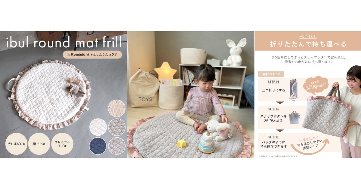 初コラボしたきゃなりんさんとsusabi開発者の実体験を元に改良を重ねた、「イブル フリルラウンドマット」は子育てママパパにとって嬉しいポイントをおさえた商品です。