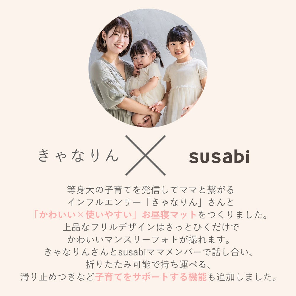 おうち時間が長くなる梅雨時期はお外に行けない分、来客も増えてまいります。ベビーキッズ用品特有のビビットカラーがインテリアになじまず、来客時のお片付けはママパパの苦労の一つとなっています。そこで、お片付けしやすいのではなく、もはやお片付け不要なくらい可愛いベビー&キッズマットを展開することにいたしました。本アイテムは、susabi初のコラボとして、等身大の子育てを発信する人気Youtuberきゃなりんさん(@channelkyanarin)と意見を重ねて開発に至った商品です。初のコラボ記念として、きゃなりんさんのフォロワー様限定で2500円OFFで提供いたします。お得なキャンペーン中に、是非、逆に置いておきたくなるフリル付きラウンドマットをお試しください。