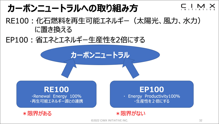 カーボンニュートラルの攻め方は2つ、RE100とEP100です。RE100は、企業が自らの事業の使用電力を100%再エネルギーでまかなうことですが、これは無理です。太陽光発電を作ってください。新電力会社との契約、グリーン証明書発行会社との契約、これは、製造業では全てコストとなります。このため、EP100が大事です。生産性を2倍にする取り組みです。