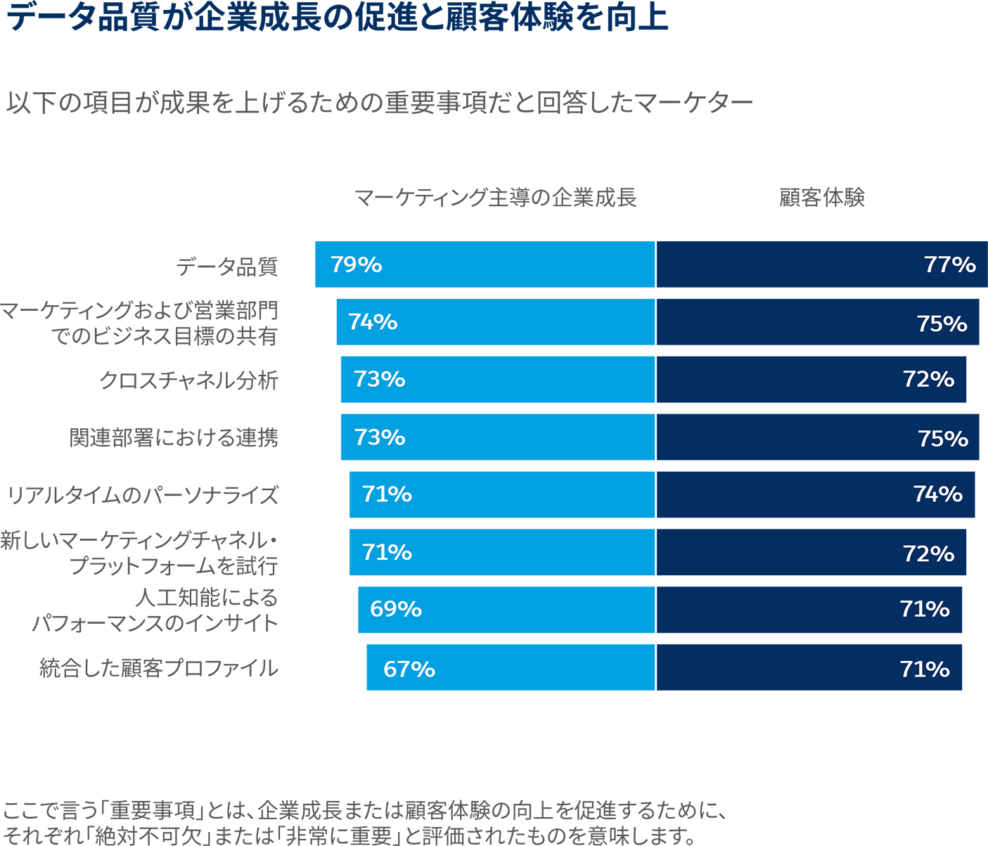 グローバルでは1位が「データ品質」2位が「マーケティング及び営業部門でのビジネス目標の共有」、そして3位が「クロスチャネル分析」となったのに対し、日本では1位が上記、2位が「データ品質」そして3位が「関連部署における連携」となりました。