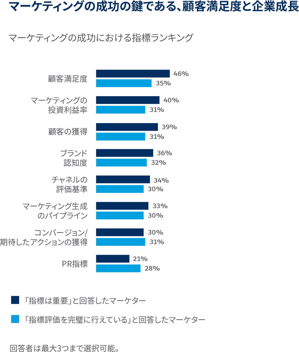 本レポートでは、ROIを最適化して企業成長を促進する、そして顧客体験を向上させるという2つの使命にあわせて、マーケティングの役割は進化していることが明示されています。マーケターは、顧客満足度とマーケティングの投資利益率の2つを最も重要な成功指標と定義しています。