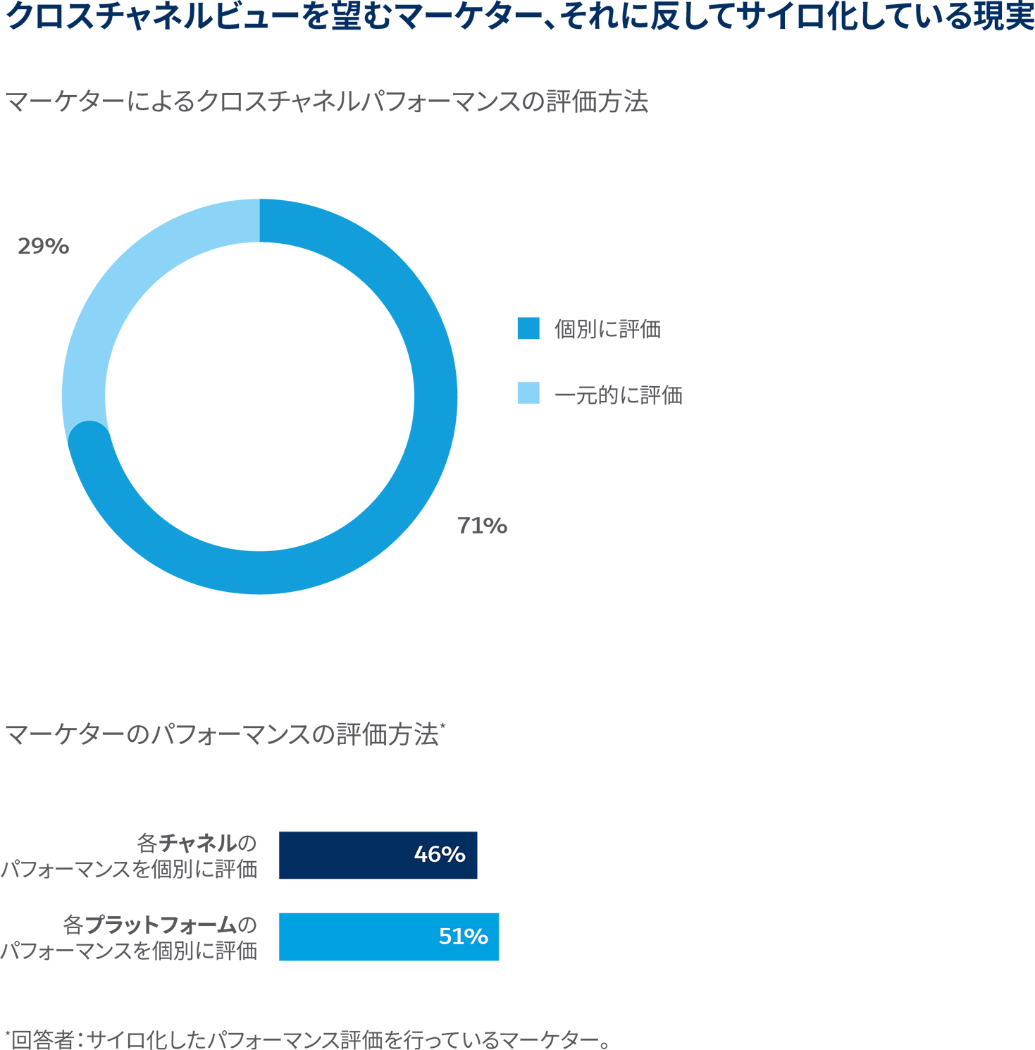 今後は、使用するデータソース数は年々増加し、データがサイロ化する可能性が高まると、マーケターは予想しています。マーケターはこういったデータすべてを一元的に把握することが重要だと感じている一方で、クロスチャネルマーケティングのパフォーマンスについて評価は、71%が一元的ではなくチャネル毎に行っており、チャネル単位(46%)もしくはプラットフォーム(51%)単位で評価されています。