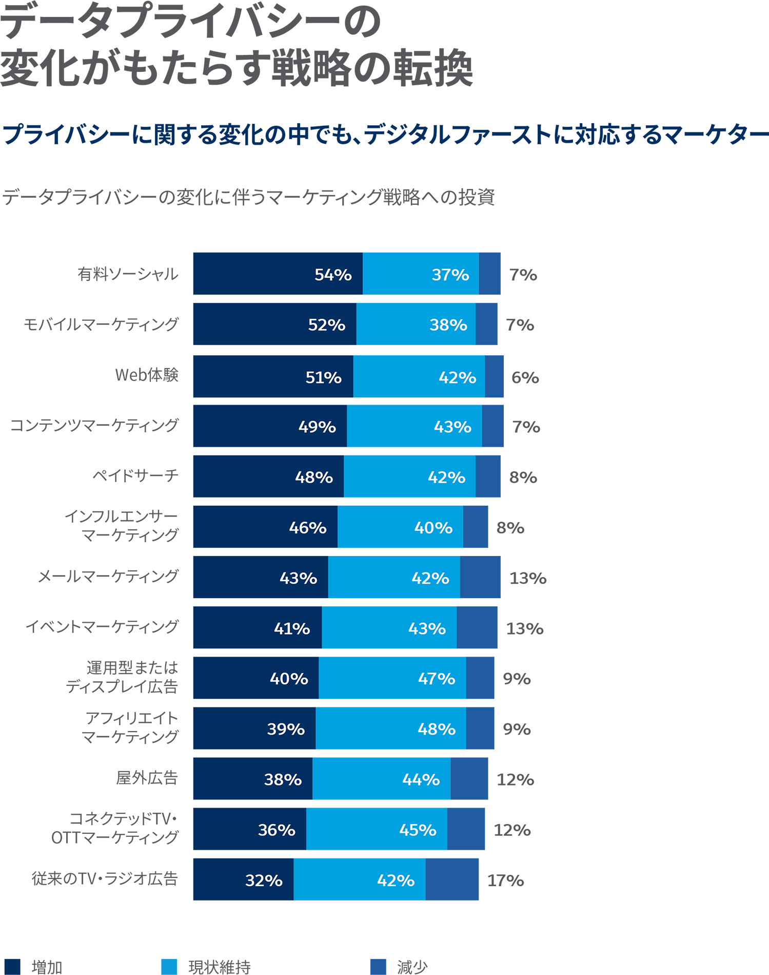 グローバルでは「マーケティング分析及び測定のテクノロジー」が最も増加。また3つのエリアについて「減少した」と回答した割合が平均8.7%に対し、日本の平均は11.7%となりました。