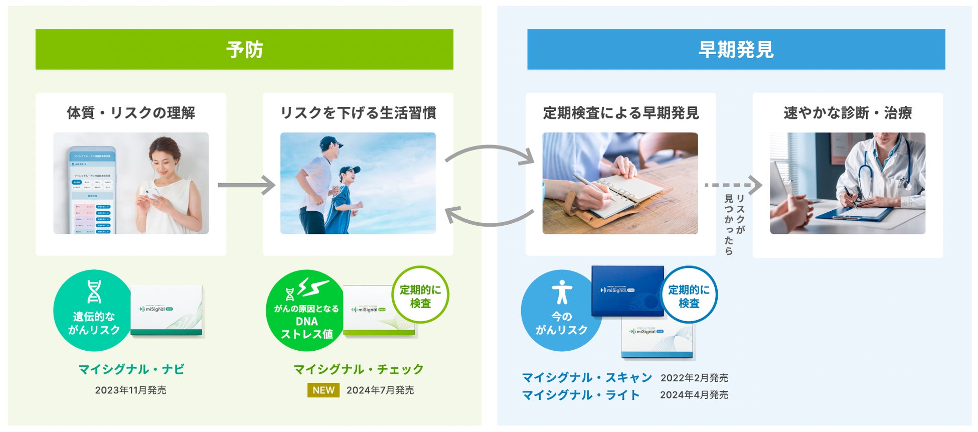 「マイシグナル®︎シリーズ」は、予防と早期発見につなげる、がんリスク検査です。このシリーズはマイクロRNA×AIでがんリスクを高精度に評価する検査「マイシグナル・スキャン」、より手軽にがんリスクを評価する検査「マイシグナル・ライト」、がんに特化した遺伝子検査「マイシグナル・ナビ」、DNAダメージをモニタリング・予防につなげる検査「マイシグナル・チェック」で構成されています。どの検査も尿やだ液を採取するだけで、体に負担なく検査することが可能です。4つの検査を通じて、自らの体質的なリスクを知り、日々のDNAのダメージをモニタリングすることで発症予防をサポート。それでも防ぎきれないがんを早期発見することを一気通貫でサポートし、がんの予防と早期発見を促進することを目指した包括的ながん対策です。