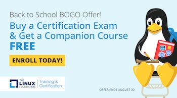Linux Foundation Training & Certificationでは、上記のような技術に加えて、ブロックチェーン、Web開発、ネットワーキング、サイバーセキュリティを含む、多くのオープンソース技術に関する包括的なトレーニングおよび認定試験を提供しています。誰もがこれらの機会にアクセスしやすくなるように、2022年8月30日まで、認定試験をを購入するとコンパニオントレーニングコース (受験準備に役立つオンラインコース) を無料で提供します。これは、例えば認定Kubernetes管理者 (CKA-JP)を購入すると、Kubernetes基礎 (LFS258-JP) に追加料金なしでアクセスできるということです。ぜひこの機会をご利用ください。
