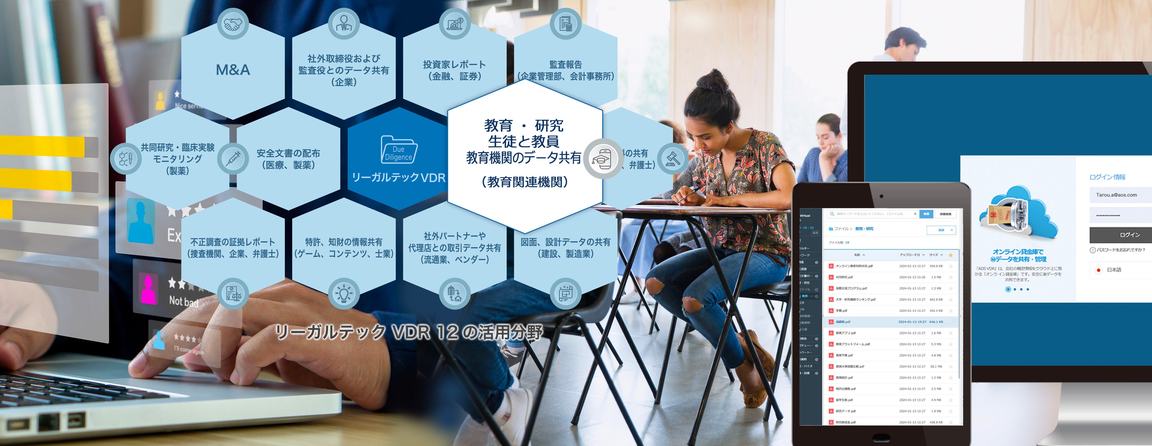 「リーガルテックVDR(Virtual Data Room)教育・研究」は、教育や研究部門におけるデータ共有の課題を解決するために有効なツールとなり得ます。「リーガルテックVDR教育・研究」が提供するソリューションは以下となります。