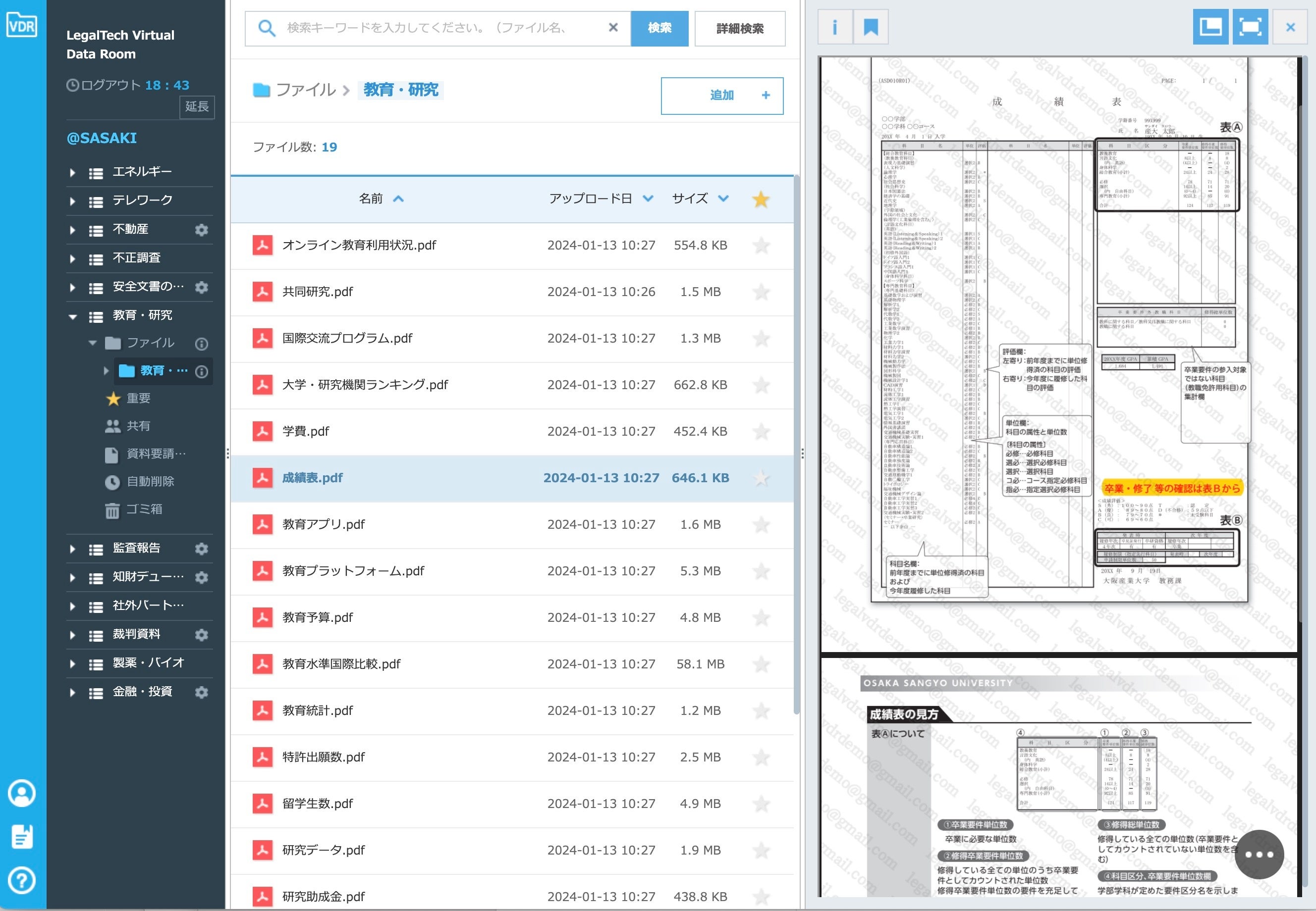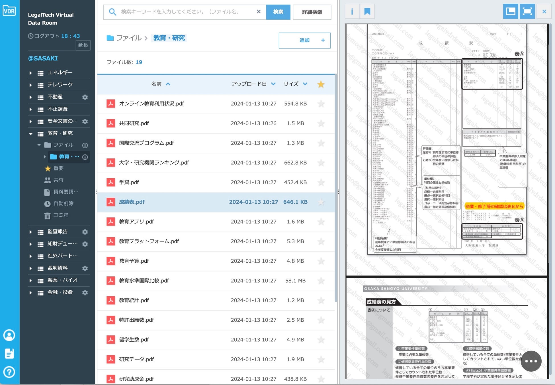 ・アクセス管理: 「リーガルテックVDR教育・研究」では、特定のドキュメントやデータへのアクセスをユーザーごとに細かく設定できます。これにより、必要な人だけが関連情報にアクセスできるように管理できます。