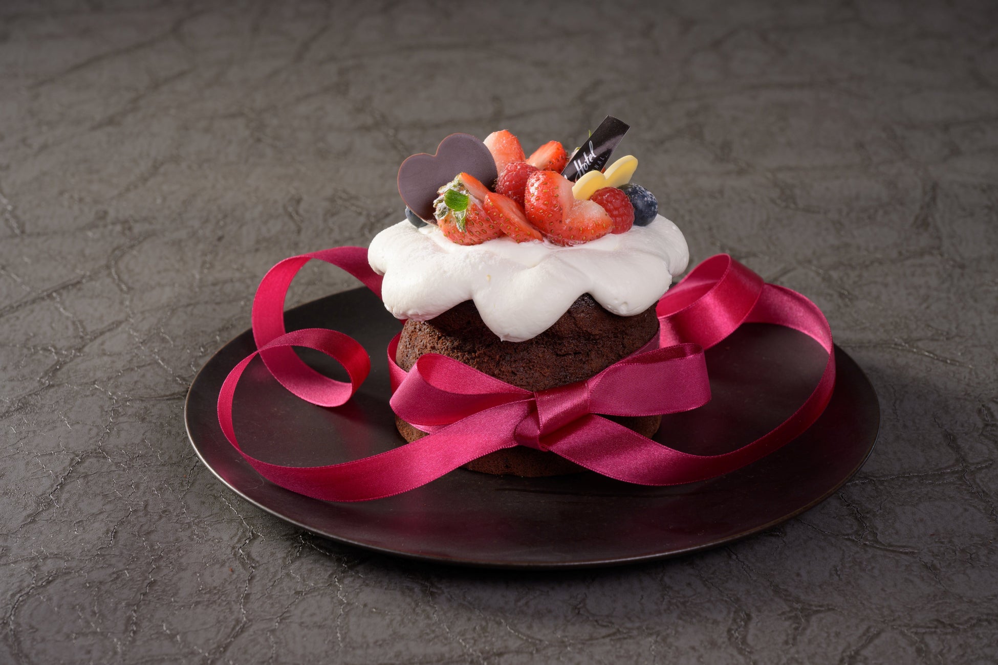 ケーキの上にはふんわりと泡立てた生クリーム、愛らしいハート型のチョコレート、鮮やかなベリーが重ねられ、まるでお花が咲いたようなデコレーションで、目でも楽しむことができます。さらに華やかなリボンを巻き付け、特別感あふれるケーキとしてご提供いたします。