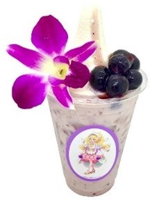 キュアフィナーレをイメージしたブルーベリーミルクのドリンクには、バニラアイスをトッピング。ブルーベリーとデンファレをのせて、見た目にも華やかなドリンクです