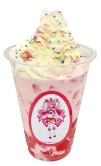 キュアプレシャスをイメージしたピーチ味のドリンク。ピーチ風味のゼリーとピーチミルクのドリンクに、ホワイトチョコホイップをトッピングしています。