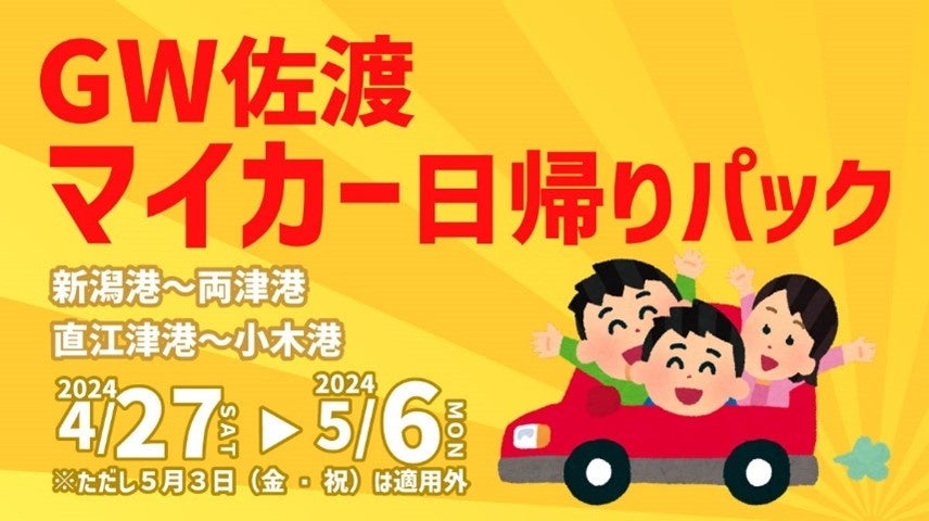 佐渡汽船株式会社は、ゴールデンウィークの4月27日(土)~5月6日(月・祝)(※5月3日(金・祝)除く)期間中、お客様に気軽に日帰り佐渡旅行をしていただきたいとの思いから、カーフェリー乗用車往復航送と往復乗船をセットにした日帰り型旅行商品「佐渡マイカー日帰りパック」を企画、発売開始いたしました。