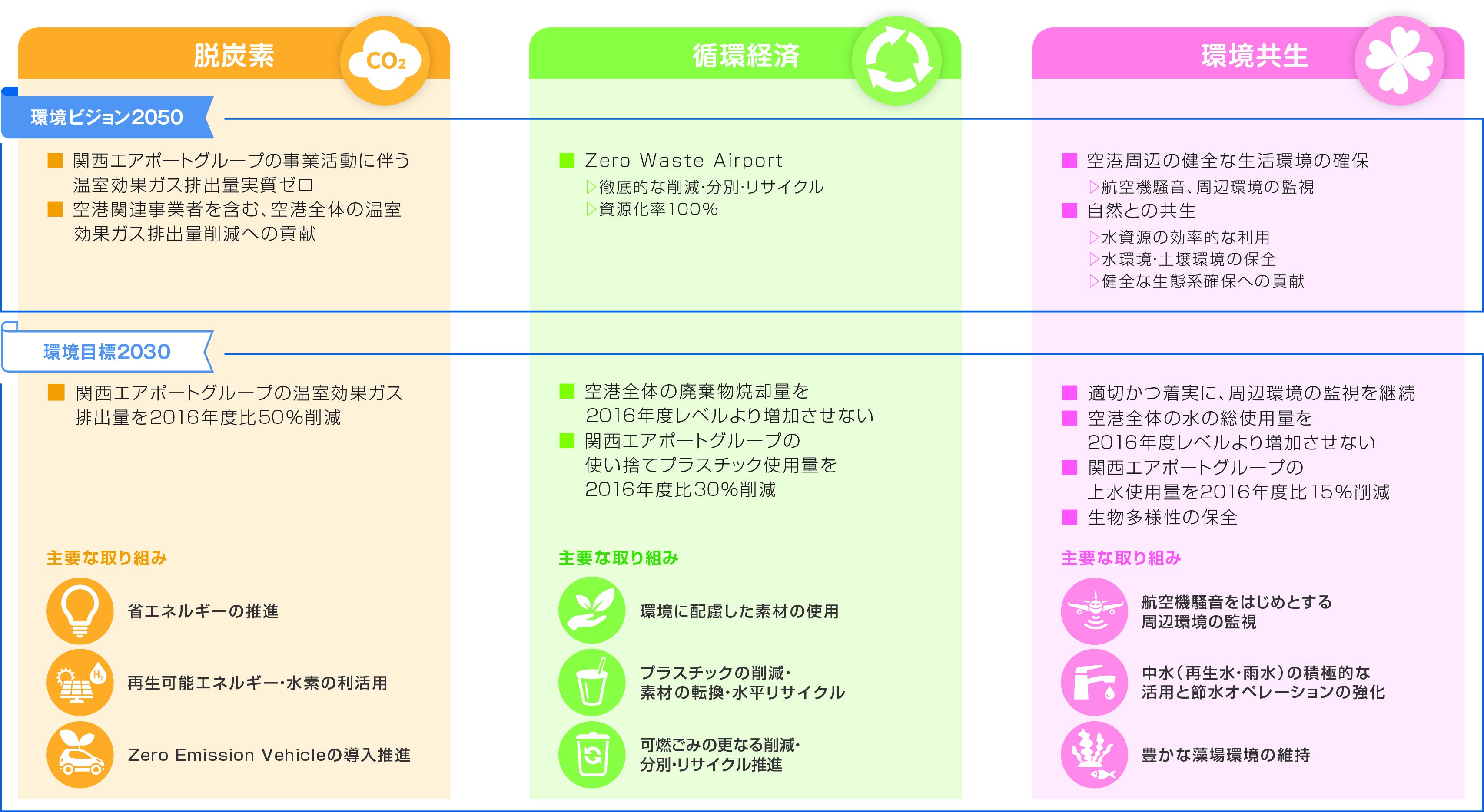 関西エアポートグループでは、これまでも運営する3空港において、環境負荷低減に向けた取り組みを積極的に行ってきました。「環境ビジョン2050」「環境目標2030」は、脱炭素をはじめとした地球規模での環境問題解決の重要性を再認識し、これまでの計画を引き継ぐだけでなく、さらに発展させて策定したものです。「脱炭素」「循環経済」「環境共生」を3つの軸として、長期的にめざす姿と、その上でマイルストーンとなる2030年の具体的な目標を設定しています。関西エアポートグループは、全社一丸となって環境負荷低減に向けた取り組みを推進し、公共インフラである空港の運営を通じて、持続可能な社会の実現に貢献してまいります。