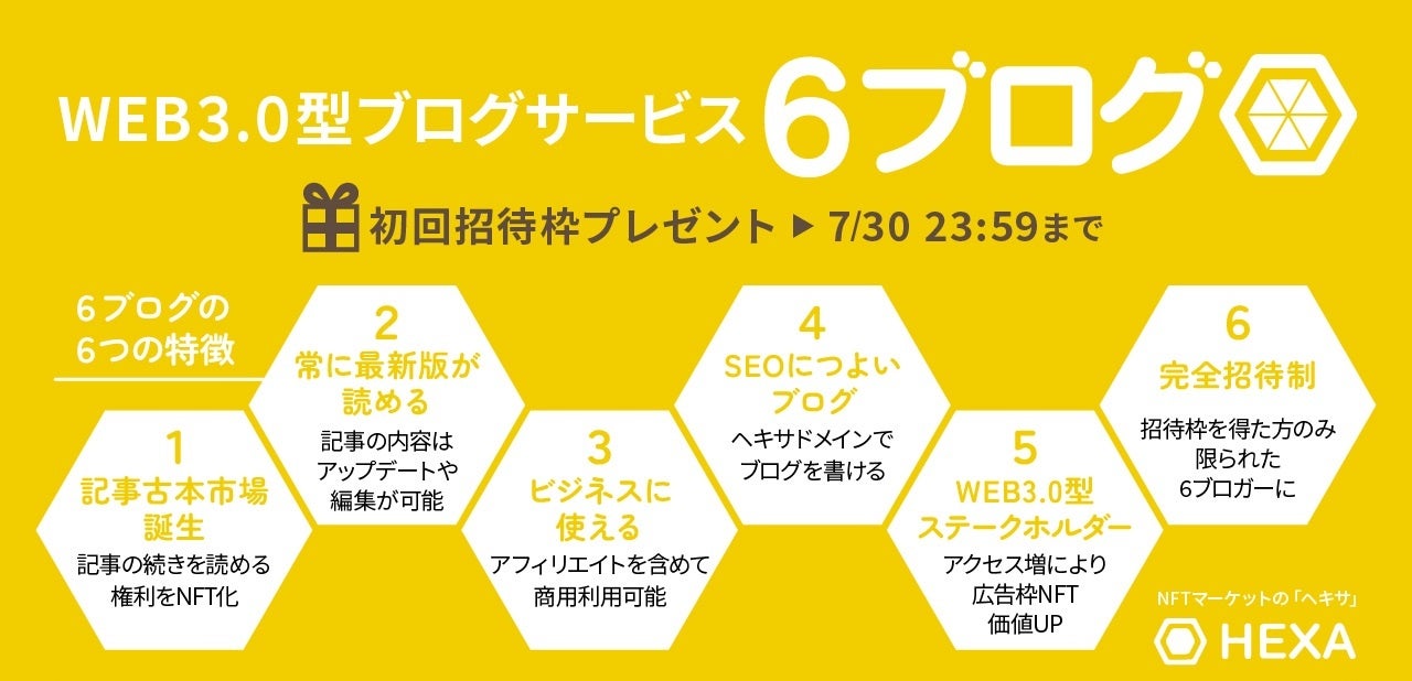 記事を古本のように売買できるWEB3.0型ブログサービス「6ブログ」、初回招待枠の配布開始!NFTマーケットのHEXA(ヘキサ)