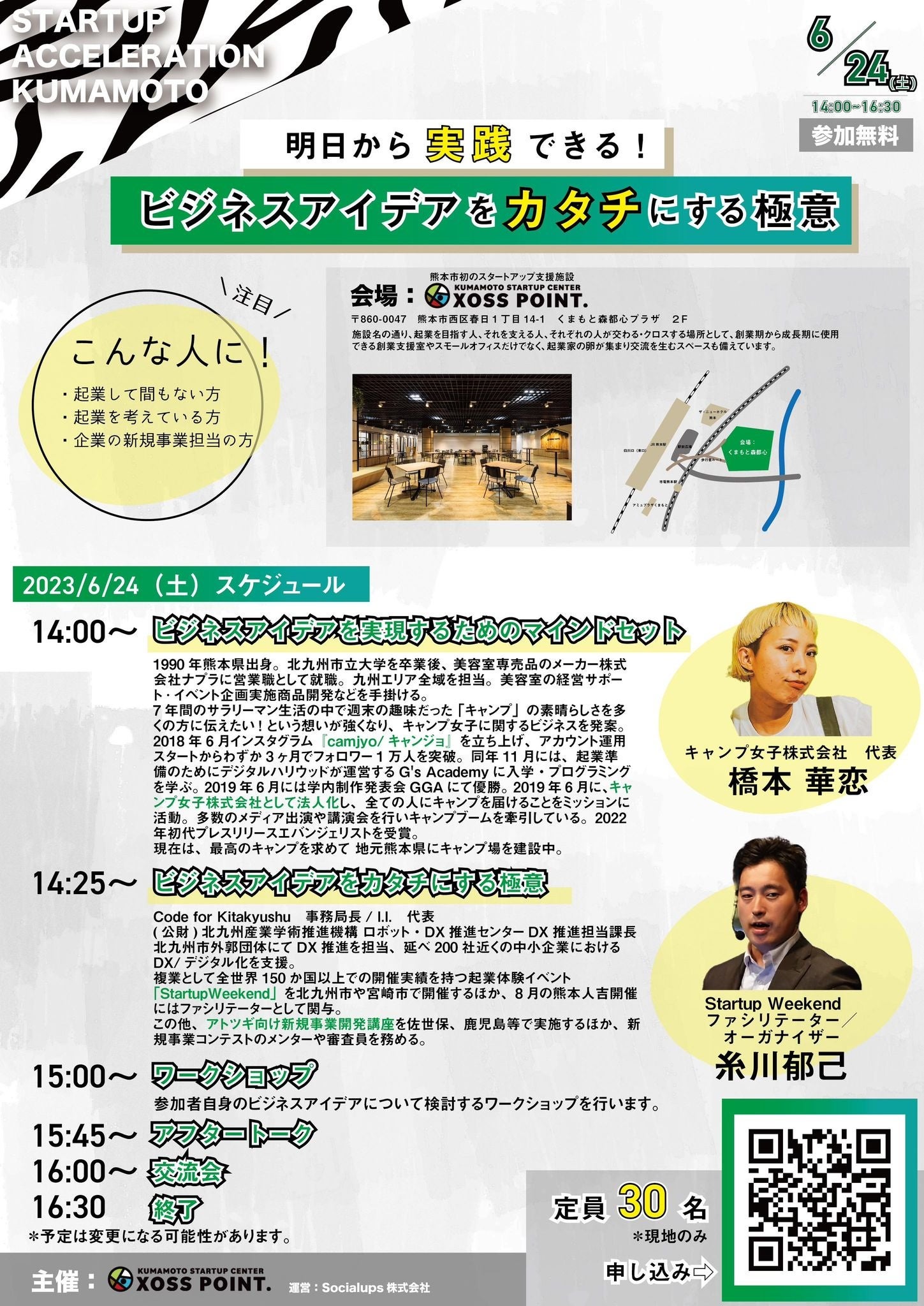 熊本市― 2023年6月23日キャンプ女子株式会社は、熊本市の創業支援施設XOSS POINT.が主催する『ビジネスアイデアをカタチにする極意』セミナーに、代表の橋本華恋が登壇いたしました。