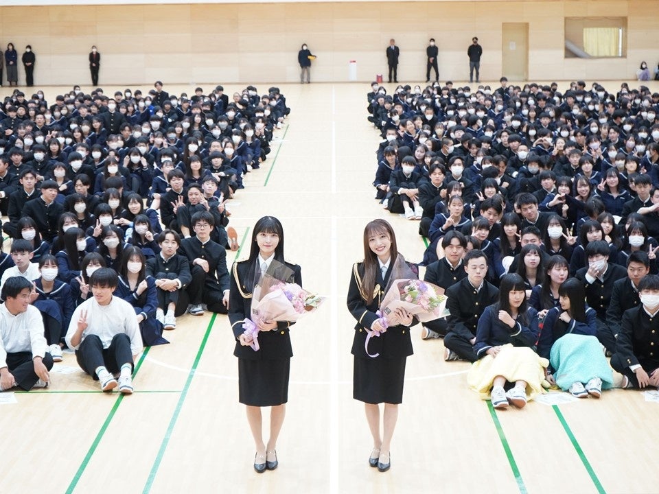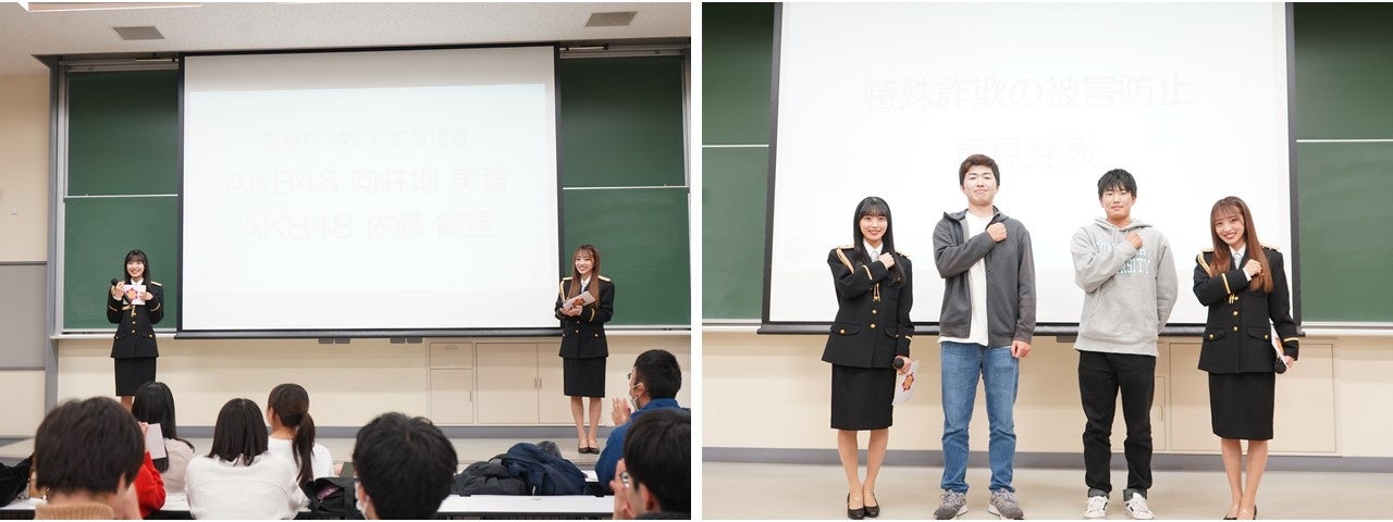 懇談後、AKB48 向井地美音支援官と佐藤綺星支援官は、山形市立商業高等学校と山形大学を訪れ、特殊詐欺被害防止についてと、犯罪実行者募集についての2つのテーマの理解を深めるべく、学生らに特別授業を行いました。