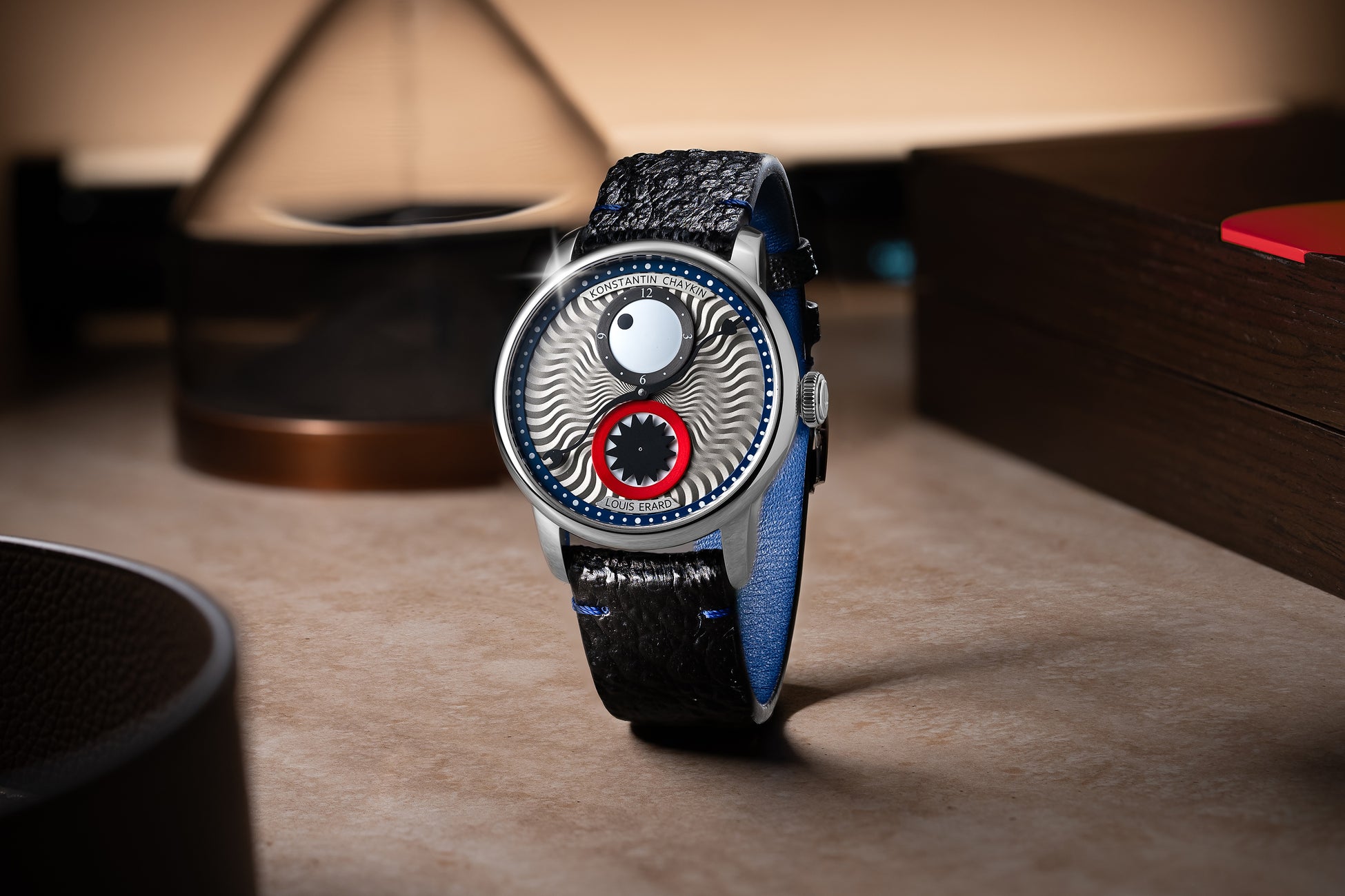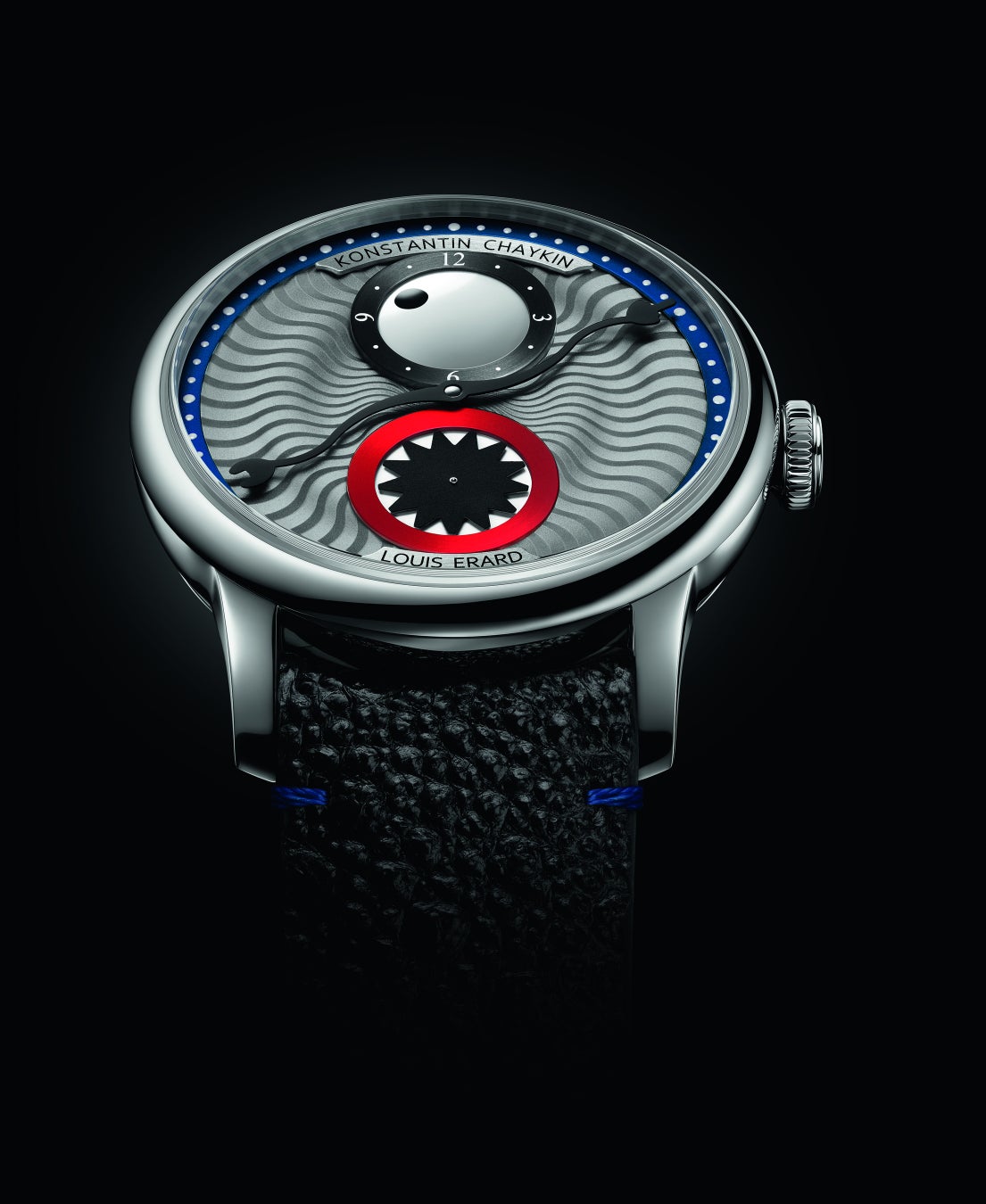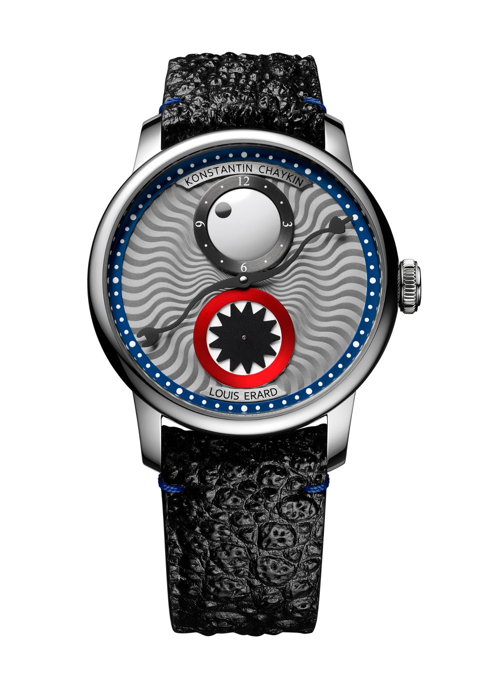 6時位置の秒表示には鋭い歯をかたどったスピニングディスクを配し、モンスターらしさを一層際立たせています。ブルーにカラーリングされた分表示リングには6時位置にルイ・エラールのロゴ、12時位置にコンスタンチン・チャイキンのネームを配置。