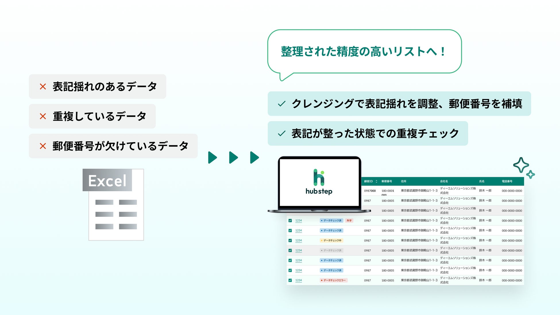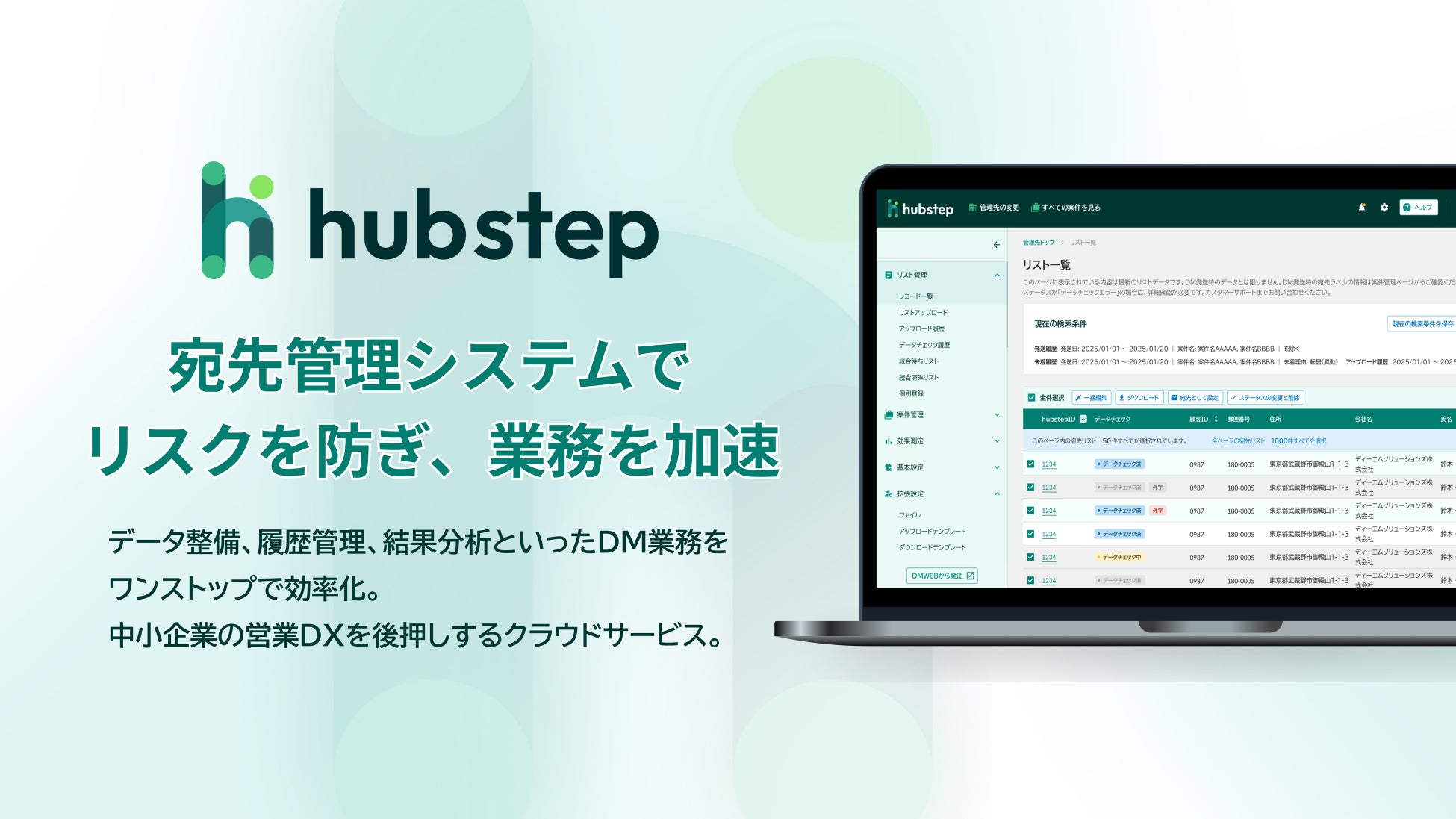 hubstepは、宛先データの整備から履歴登録までを自動化し、宛先管理業務を安全かつ効率的に運用できるクラウドサービスです。