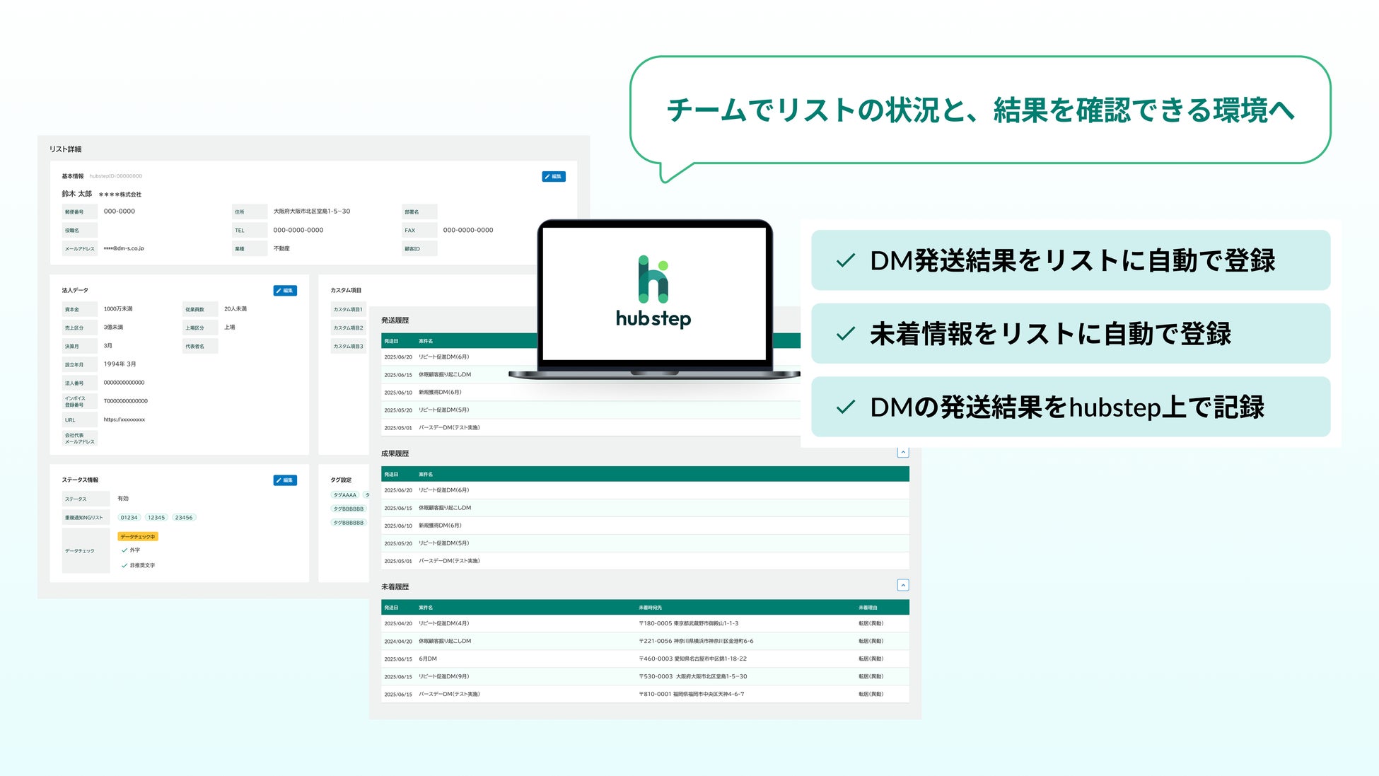 こうした環境を受け、当社はこれまで15,000社以上のDM運用支援で培った知見をもとに、“現場が安全に使える”宛先管理ツールとして「hubstep」を開発しました。