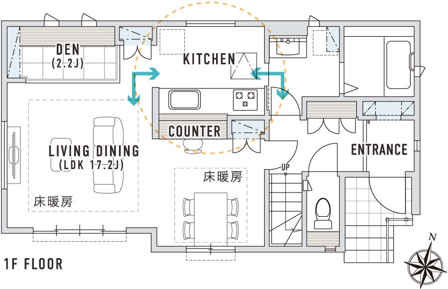 キッチンを中心に、そのまわりを回遊できる動線を確保しました。スムーズに家事をこなすことができ、ゆとりの時間を生み出します。無駄を省いた回遊性は家族との時間や自分時間を充実させるプランです。