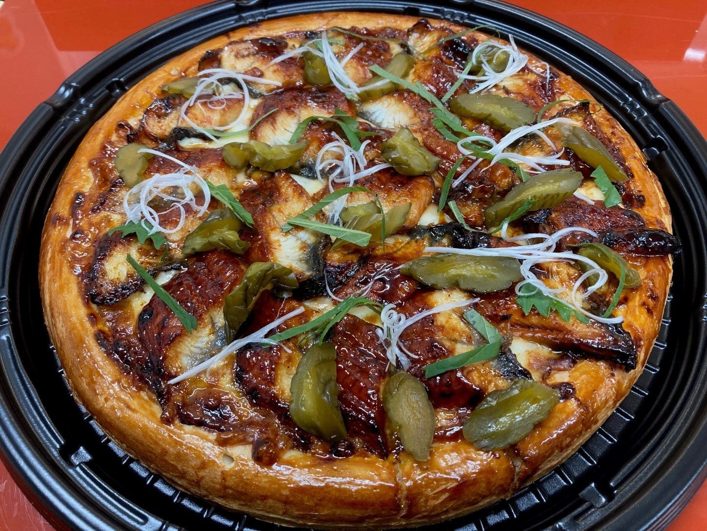 土用の丑の日に向けたメニューを検討中、『うなぎの蒲焼きのピザは?』という話から開発されたという“ぴつまぶし”。
