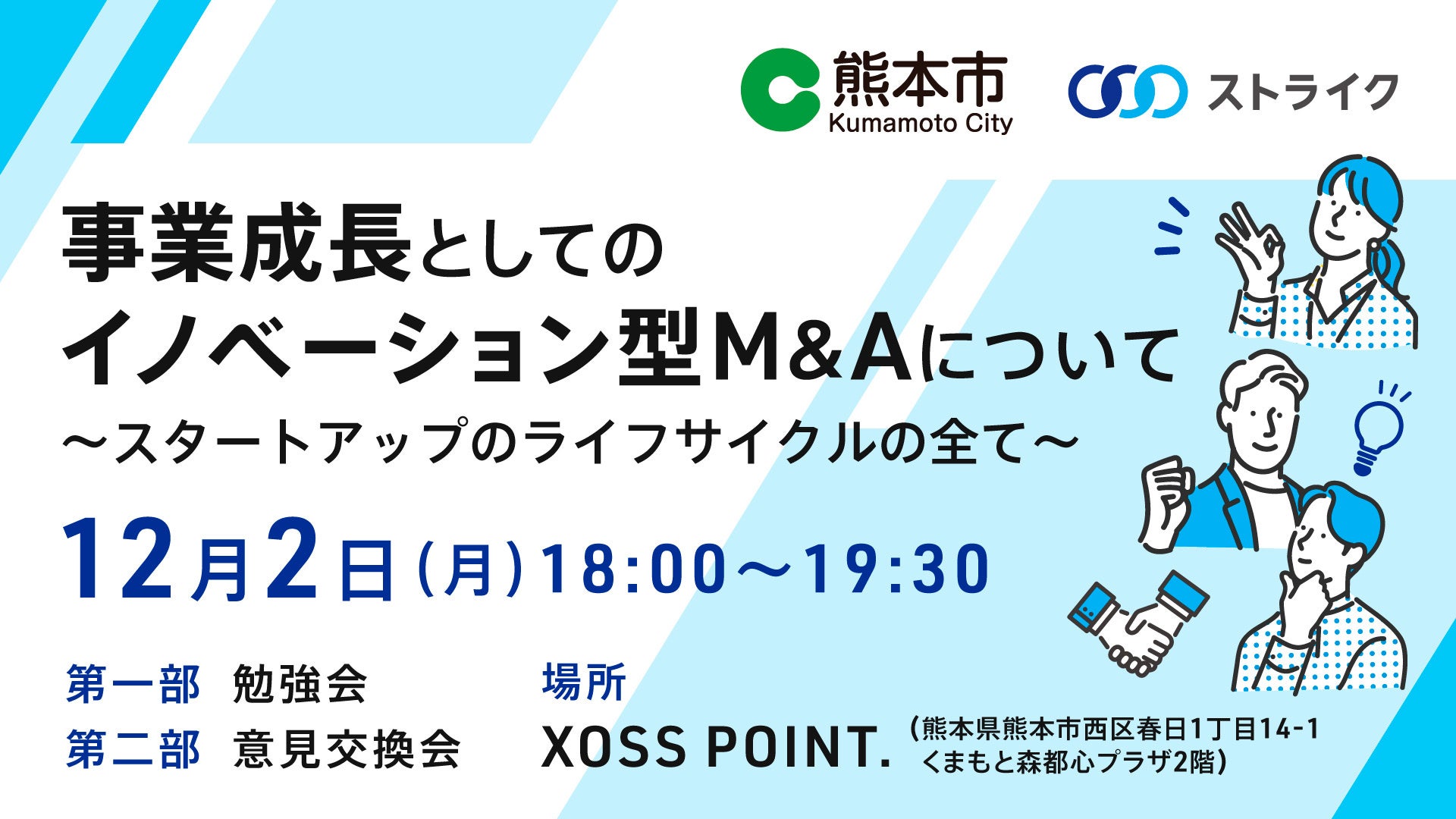 熊本市(市長:大西 一史)は、令和6年(2024年)12月2日(月)に、ビジネス支援施設「XOSS POINT.」で熊本市と株式会社ストライクの共催でセミナーを実施します。本セミナーでは、事業成長の戦略としてのイノベーション型M&Aについて、実際にM&Aを活用された事例をもとにお話しします。