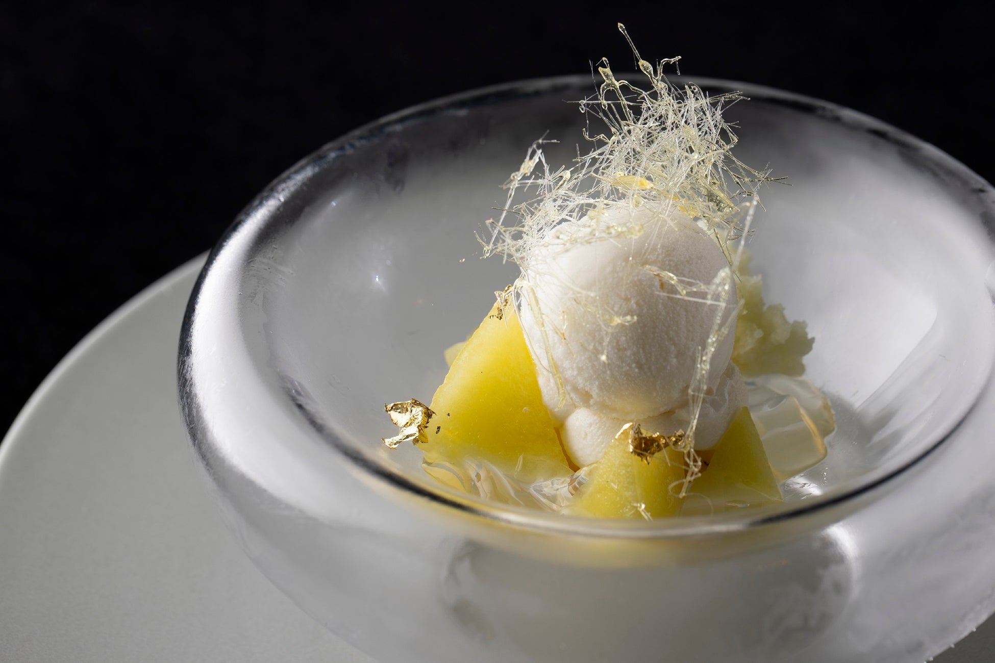 「マスクメロンのデザート シャンパンとミルクのアイスクリーム」