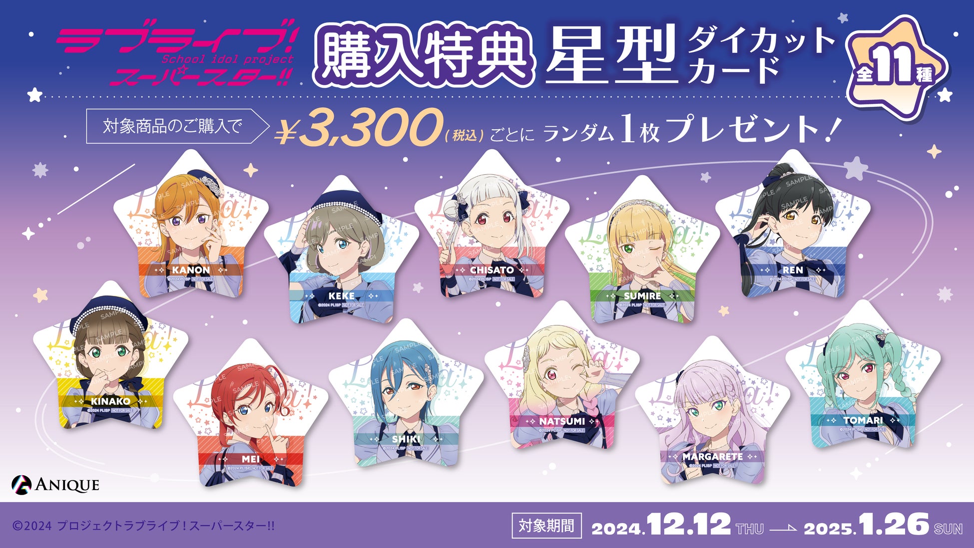 販売期間中(2024/12/12~2025/1/26)、「ラブライブ!スーパースター!!」対象商品を3,300円(税込)お買い上げごとに【購入特典】星型ダイカットカード(全11種)をランダムで1点プレゼントいたします。