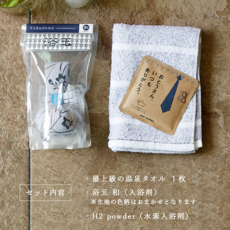 内容:最上級の温泉タオル(今治タオル)1枚、浴玉1個、水素入浴剤1個