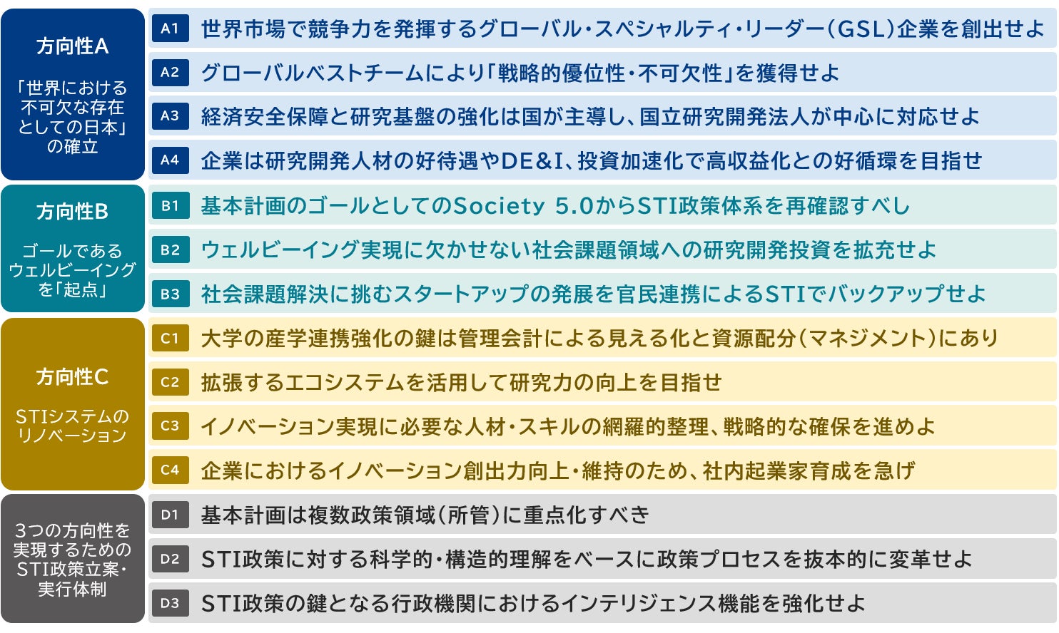 こうした背景を踏まえ、MRIは、日本の科学技術・イノベーション力の強化のためにSTI政策が目指すべき「3つの方向性」(以下 A~C)と、その実現のための「STI政策立案・実行体制」(D)を定めました。
