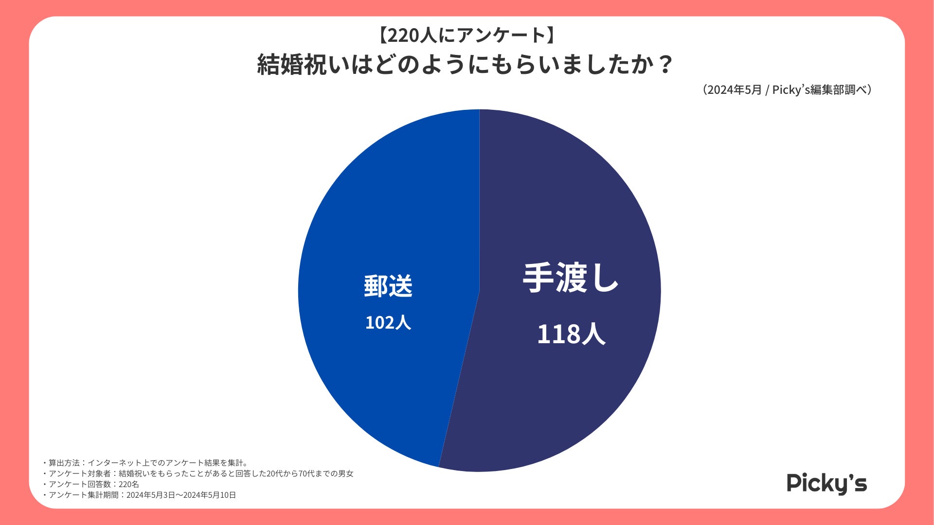 アンケート調査の結果、「手渡し」と回答された方が多い結果となりましたが、郵送で贈られたと回答された人数差はあまりない結果となりました。コロナの影響やお互いの負担が少ないなどという考えの傾向もあり、近年では郵送で結婚祝いを贈られる方もふえている傾向にあるようです。