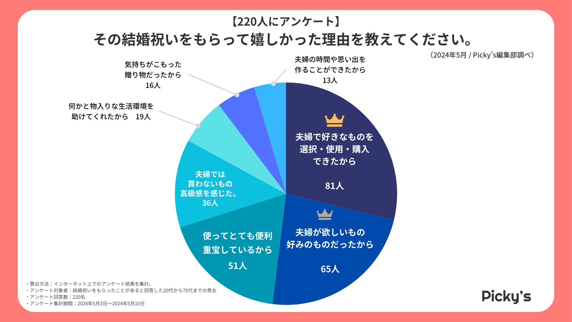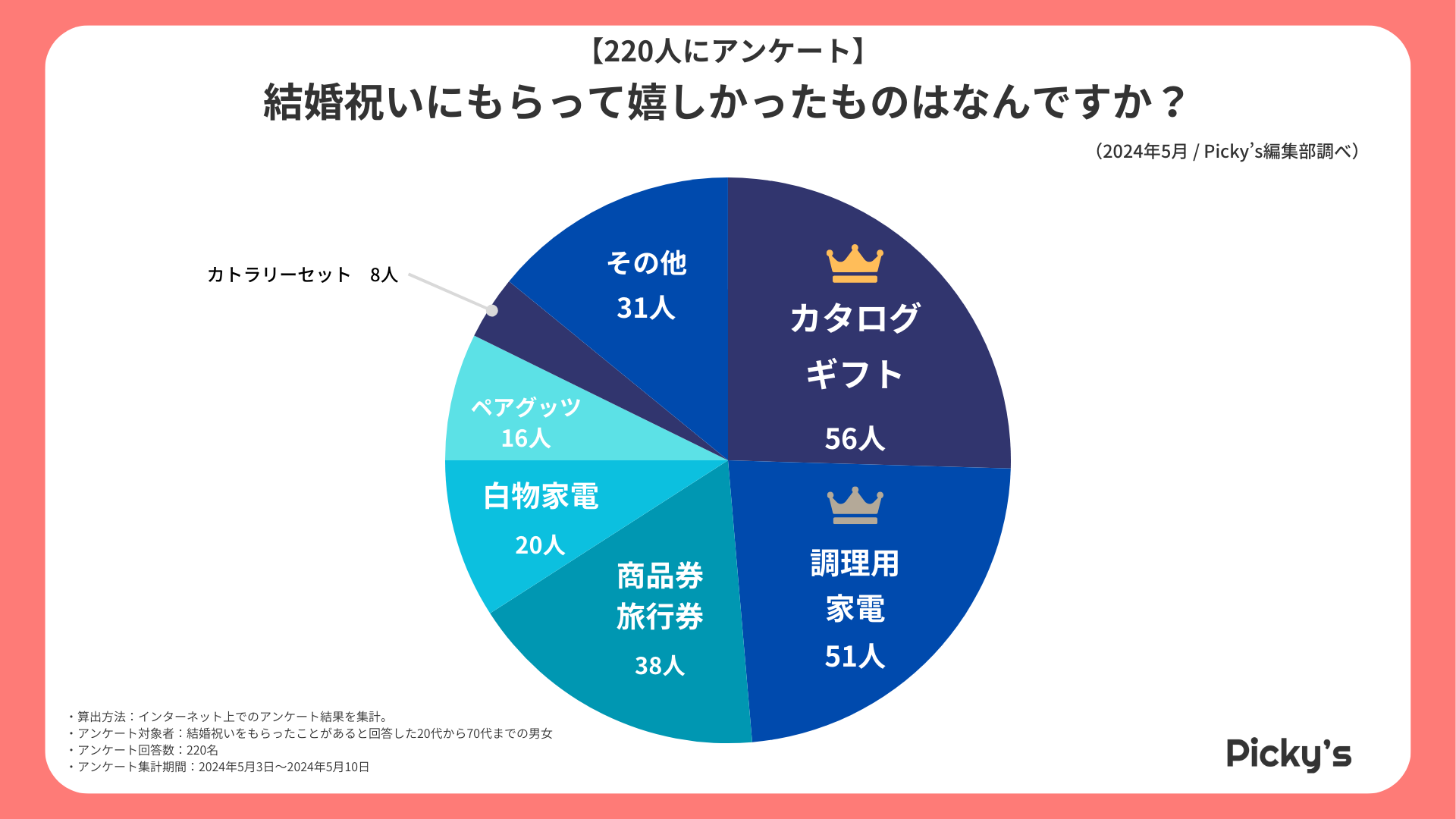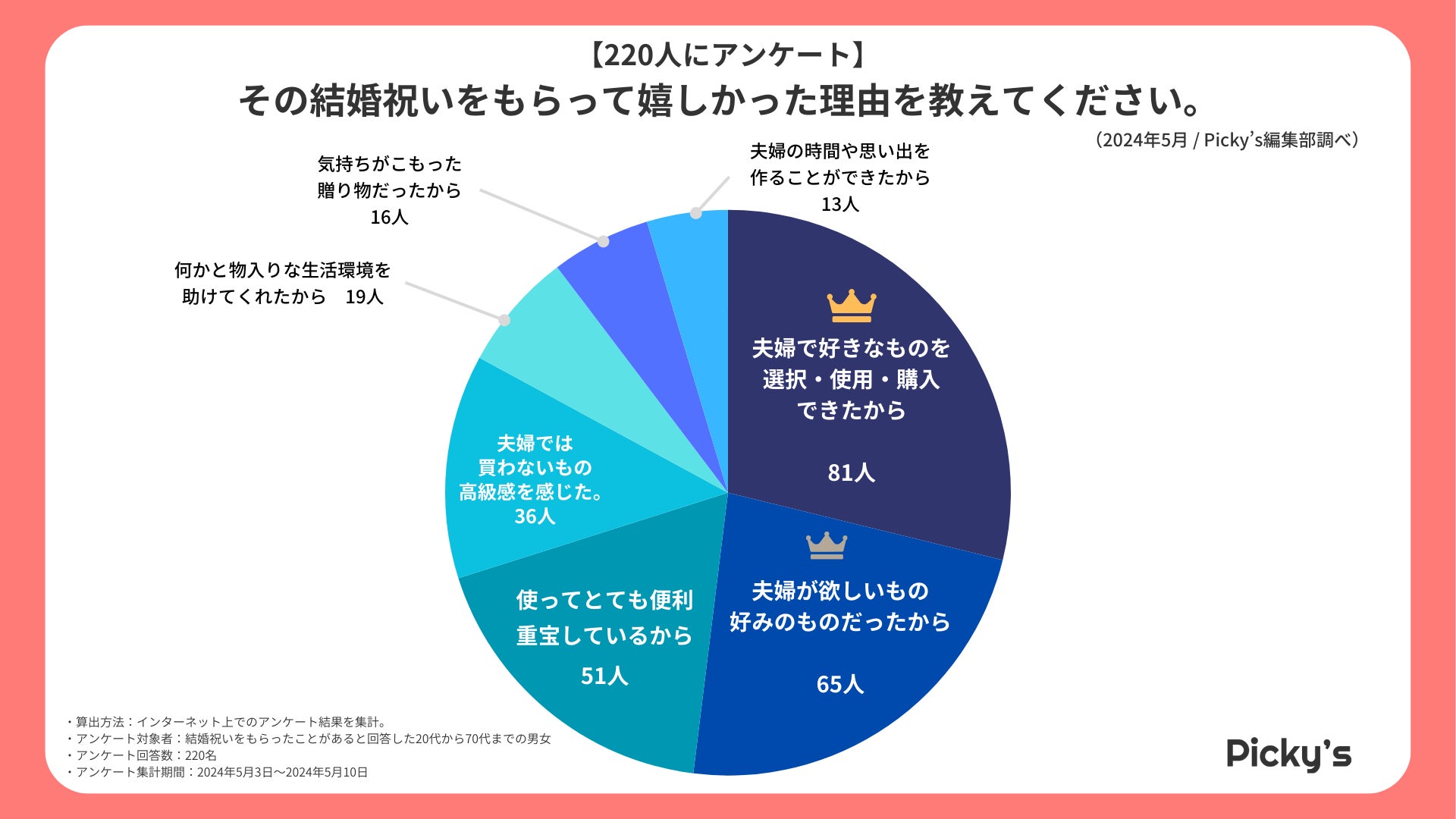 「Picky’s」は、インターネットショッピングにおいて、購入前に試せない・選ぶべきものがわからないという課題の解決を目標に、あらゆる商品のおすすめランキングや検証レビューを紹介するサイトです。このたびPicky’s(https://rentry.jp/)では、結婚祝いでもらって嬉しかったものついてインターネット上でアンケート調査を行いましたので発表いたします。