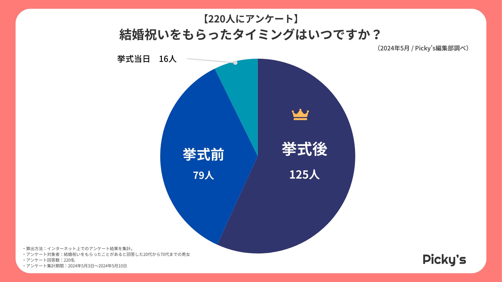 アンケート調査の結果、半数以上の方が「挙式後」に結婚祝いをもらっておりました。