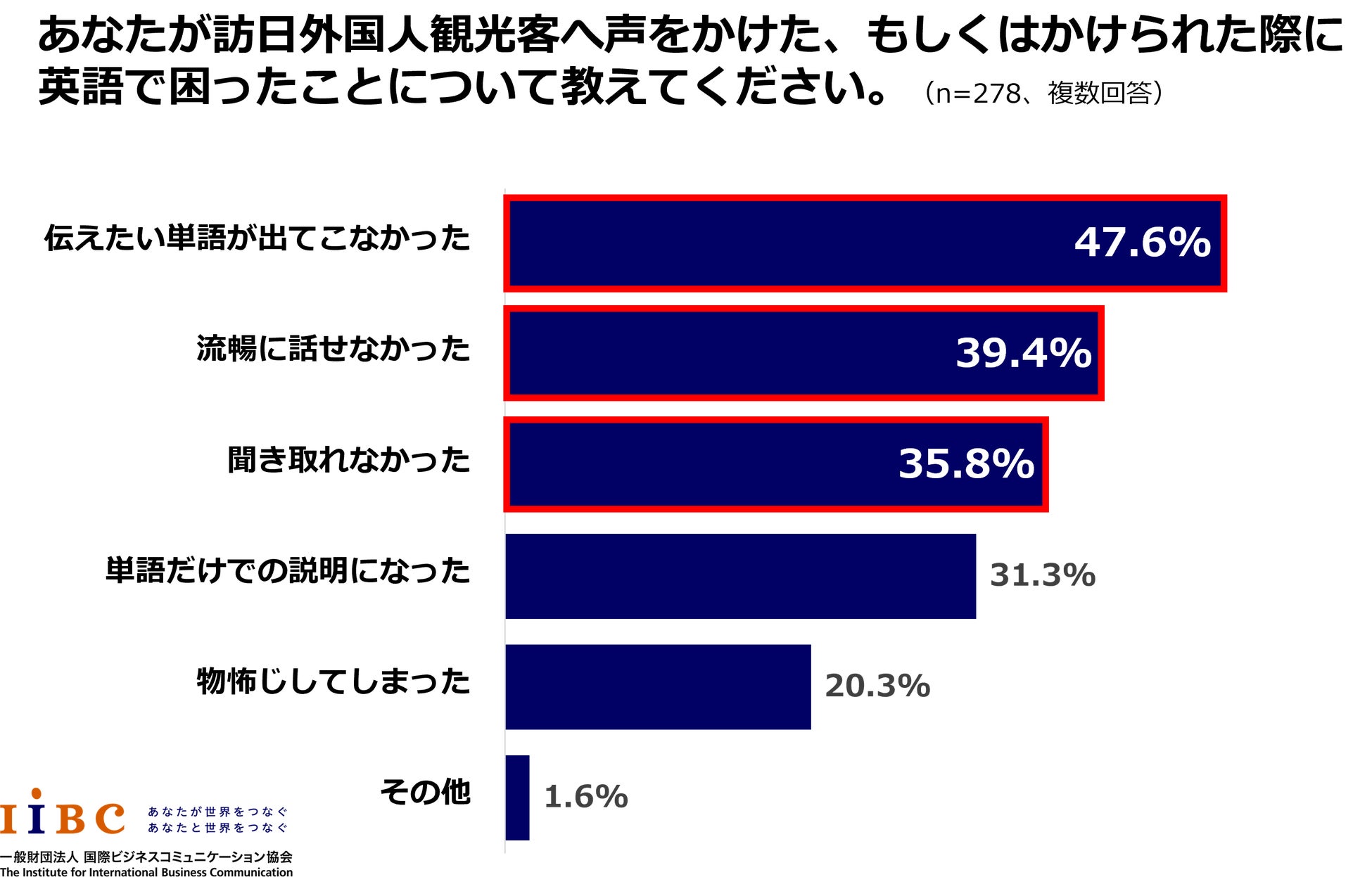 一方で、88.5%の人が訪日外国人観光客に声をかけた、もしくはかけられた際に困った経験があることがわかりました。困った理由としては、1位「伝えたい単語が出てこなかった」(47.6%)、続いて「流暢に話せなかった」(39.4%)、「聞き取れなかった」(35.8%)となりました。普段英語に触れたり発信したりする機会が少ない分、いざという時に困ることもありそうです。